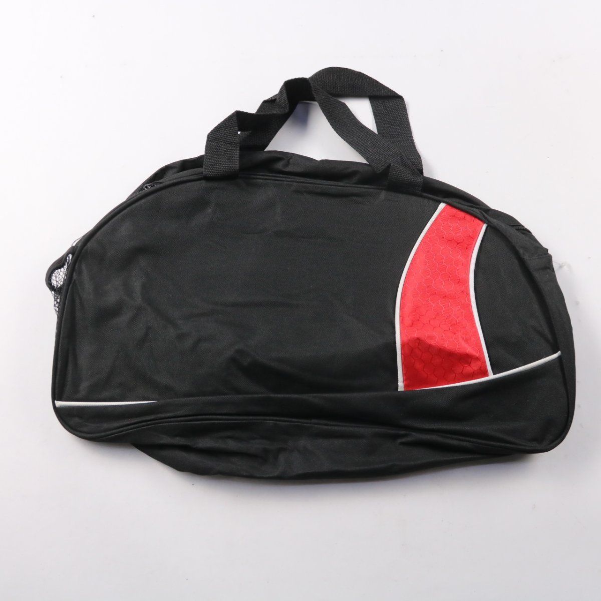 Дорожная сумка без указанного бренда, выполнена из плотного текстиля, чёрная с красной вставкой. Подойдёт для спорта, поездок и как ручная кладь; есть верхние ручки и боковой сетчатый карман. Лёгкая и компактно складывается за счёт мягкой конструкции.