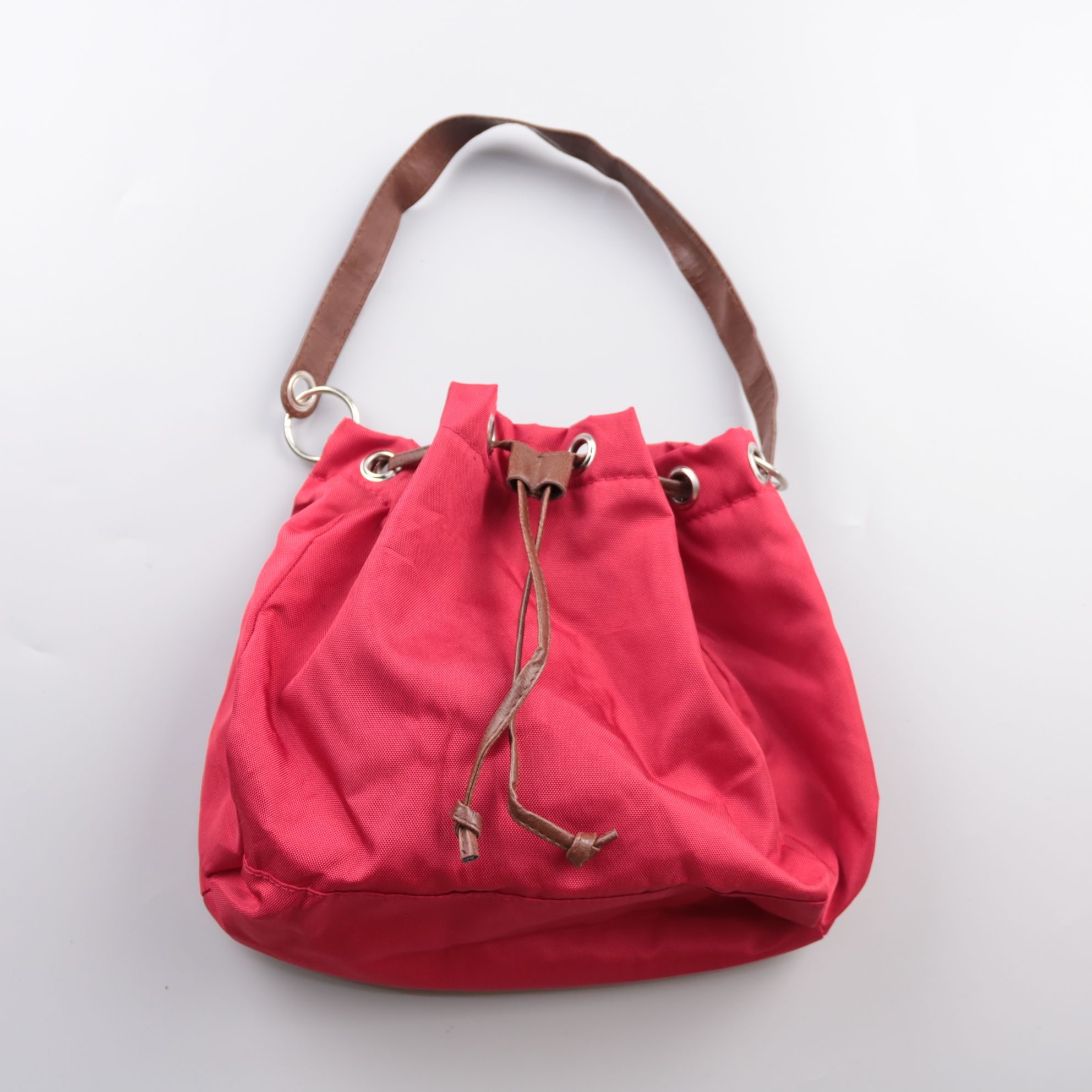 Тканевая сумка-мешок ярко‑красного цвета с коричневой ручкой и шнуровкой. Подойдёт для повседневных прогулок и поездок, когда нужно быстро сложить самые нужные вещи. Лёгкая и вместительная, удобно затягивается сверху.