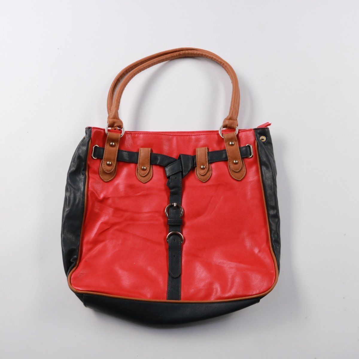 Женская сумка с ручками в красно‑чёрной гамме, с декоративными ремешками и металлической фурнитурой. Подойдёт для повседневных выходов и городских образов, внутри одно основное отделение с карманами. Удобно носить в руке или на предплечье благодаря плотным ручкам.