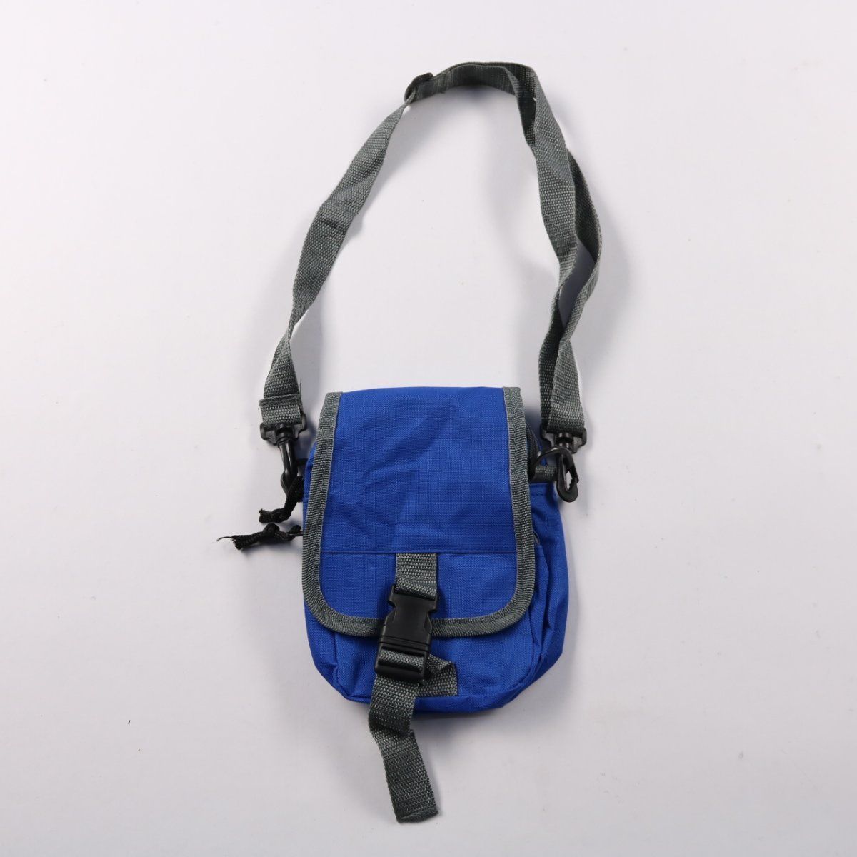 Небольшая сумка через плечо в синем цвете с серым регулируемым ремнём и клапаном на фастексе. Подойдёт для прогулок и поездок, чтобы держать телефон, документы и мелочи под рукой. Лёгкая и компактная, с отдельным карманом на молнии для более надёжного хранения.