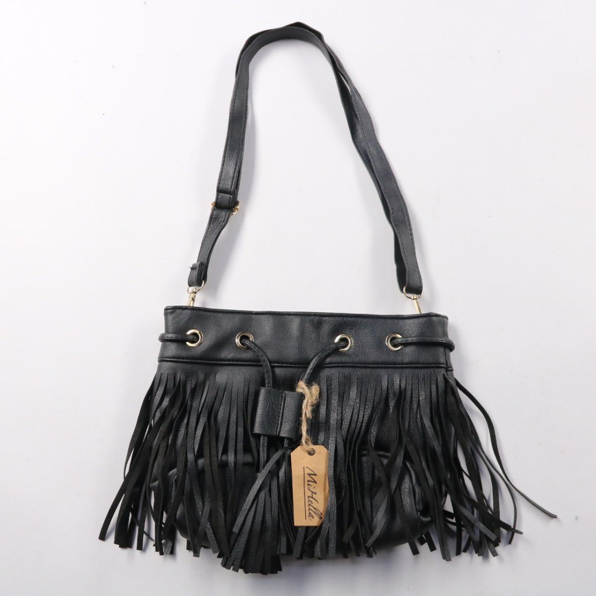 Сумка через плечо с длинным регулируемым ремнём и декоративной бахромой по передней части. Подойдёт для повседневных выходов и образов в стиле casual/boho, когда нужно взять с собой самое необходимое. Затягивается шнурком через люверсы, удобно носить на плече или как кросс-боди.