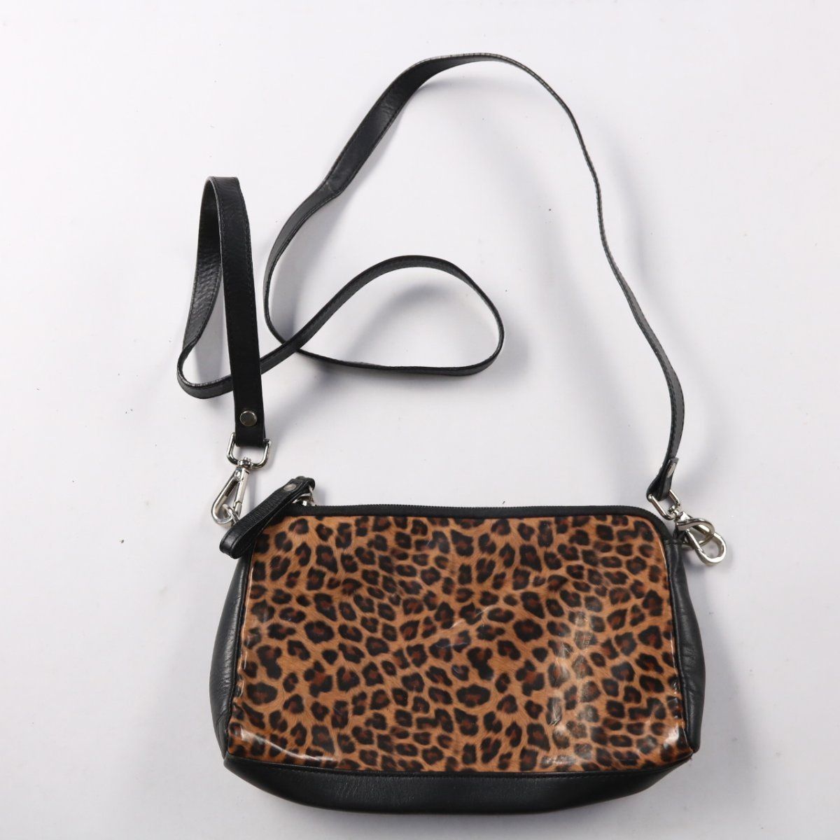 Сумка кросс-боди с леопардовым принтом на лицевой стороне и чёрной отделкой, бренд не указан. Подойдёт для прогулок и повседневных образов, закрывается на молнию. Длинный ремень на карабинах можно отстегнуть, удобно носить через плечо.