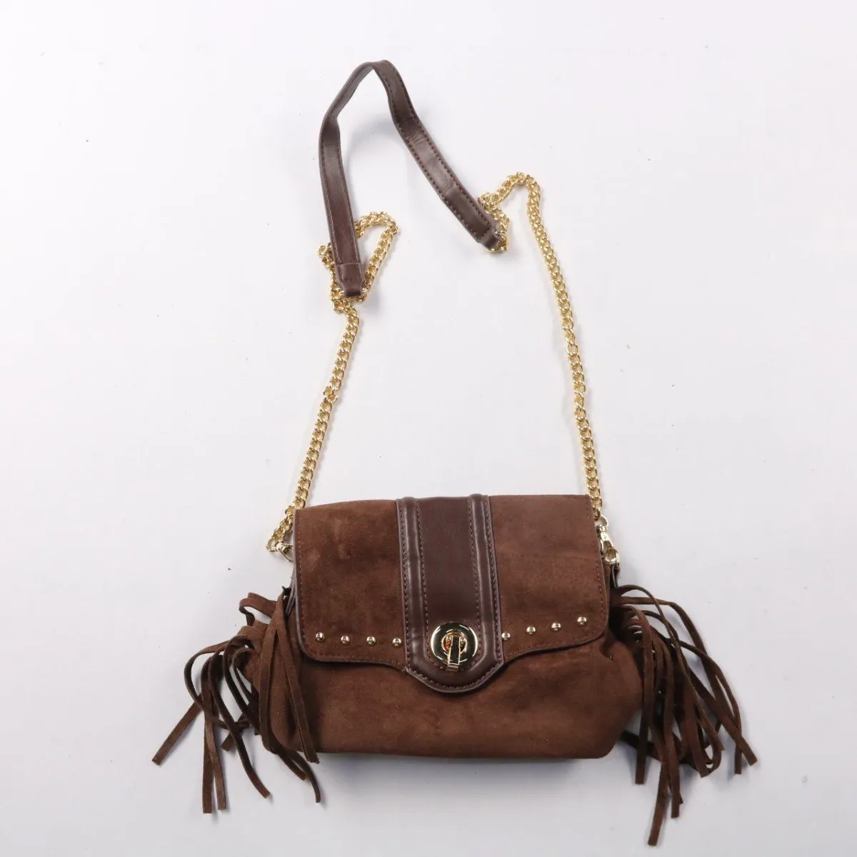 Сумка через плечо с бахромой и цепочным ремнём, бренд не указан. Подойдёт для повседневных выходов и образов в стиле casual/boho, закрывается на поворотный замок под клапаном. Практичный плюс — компактный формат и несколько отделений внутри для мелочей.