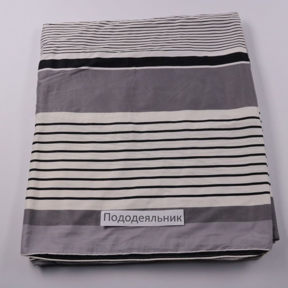 Пододеяльник в серо-белой расцветке с полосками, без указанного бренда. Подойдёт для повседневного использования дома и хорошо сочетается с нейтральным интерьером. Практичен тем, что рисунок немаркий и легко подбираются однотонные наволочки и простыня.