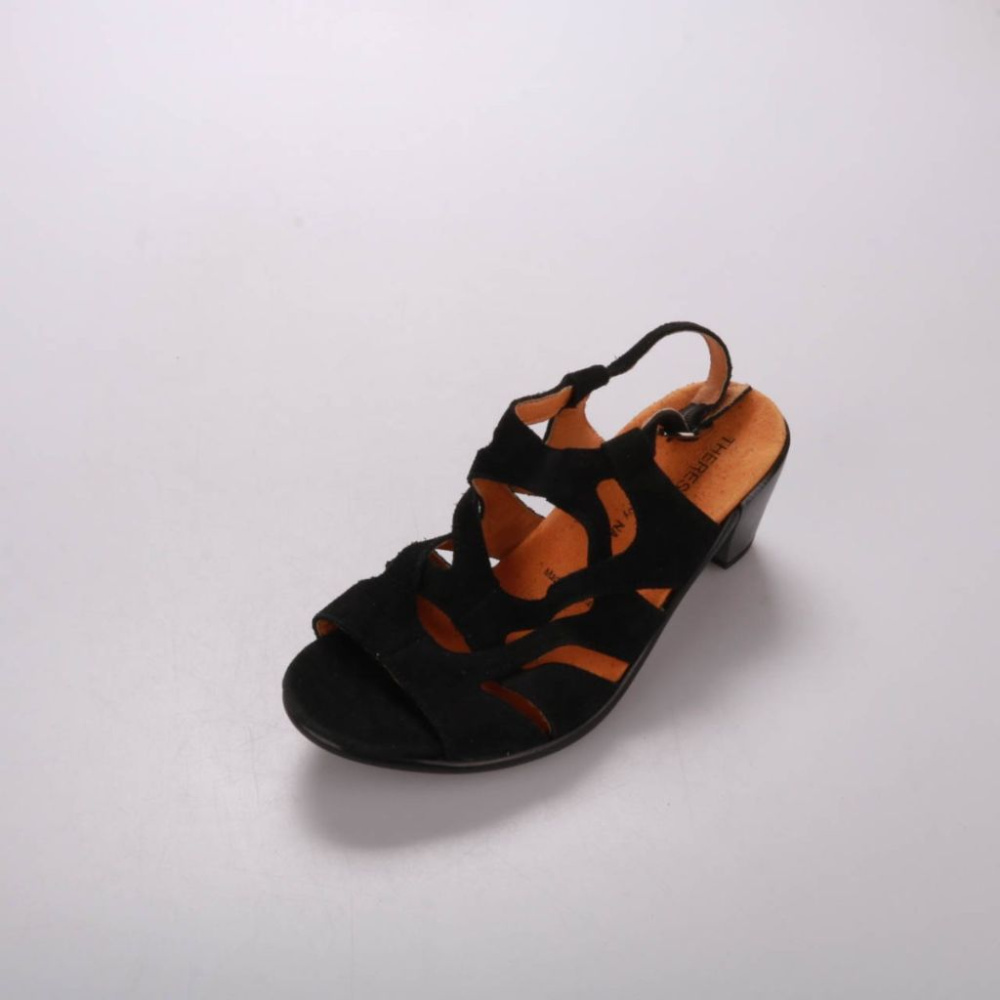 Женские босоножки Theresia M. из чёрной замши/нубука с фигурными ремешками и открытым носком. Подойдут для летних прогулок и повседневных образов, устойчивый невысокий каблук удобен при длительной носке.