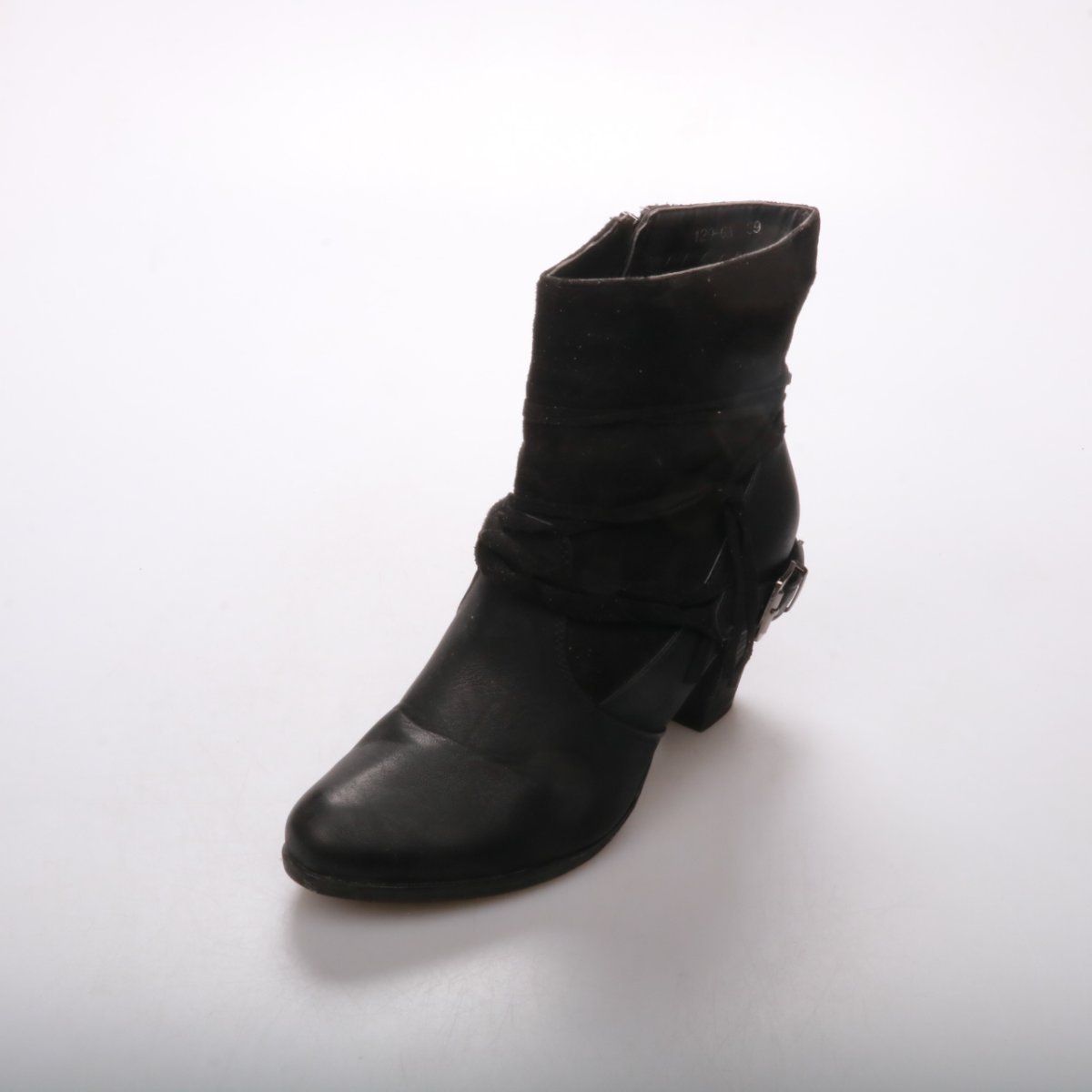 Женские черные ботильоны на устойчивом каблуке с боковой молнией и декоративными ремешками. Подойдут для повседневных образов в прохладную погоду — на осень и весну. Практичный плюс: удобный каблук и нескользящая подошва с рельефом.