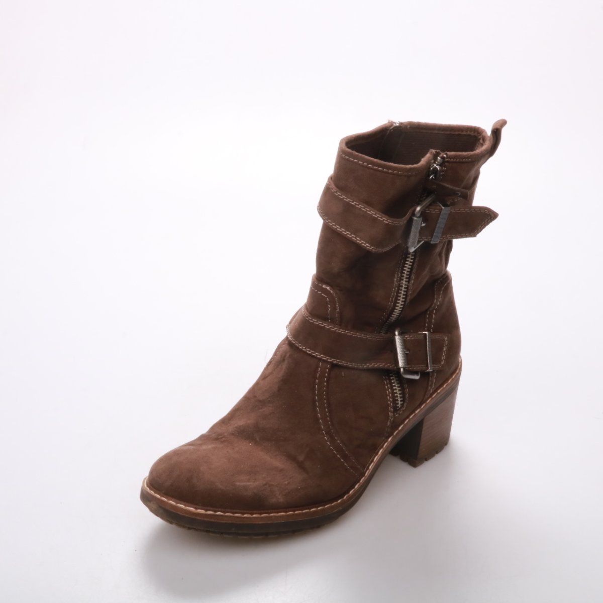 Женские коричневые замшевые ботильоны на устойчивом каблуке, с боковой молнией и ремешками с пряжками. Подойдут для повседневных образов в прохладную погоду — с джинсами, платьями и пальто. Рельефная подошва даёт более уверенное сцепление и комфорт при ходьбе.