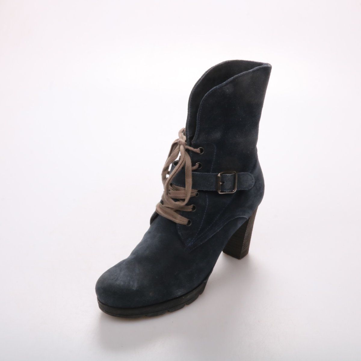 Женские замшевые ботильоны на шнуровке с отворотом и ремешком с пряжкой, темно-синего цвета. Подойдут для повседневных образов в демисезон с джинсами и юбками. Устойчивый каблук и рельефная подошва дают уверенную опору при ходьбе.
