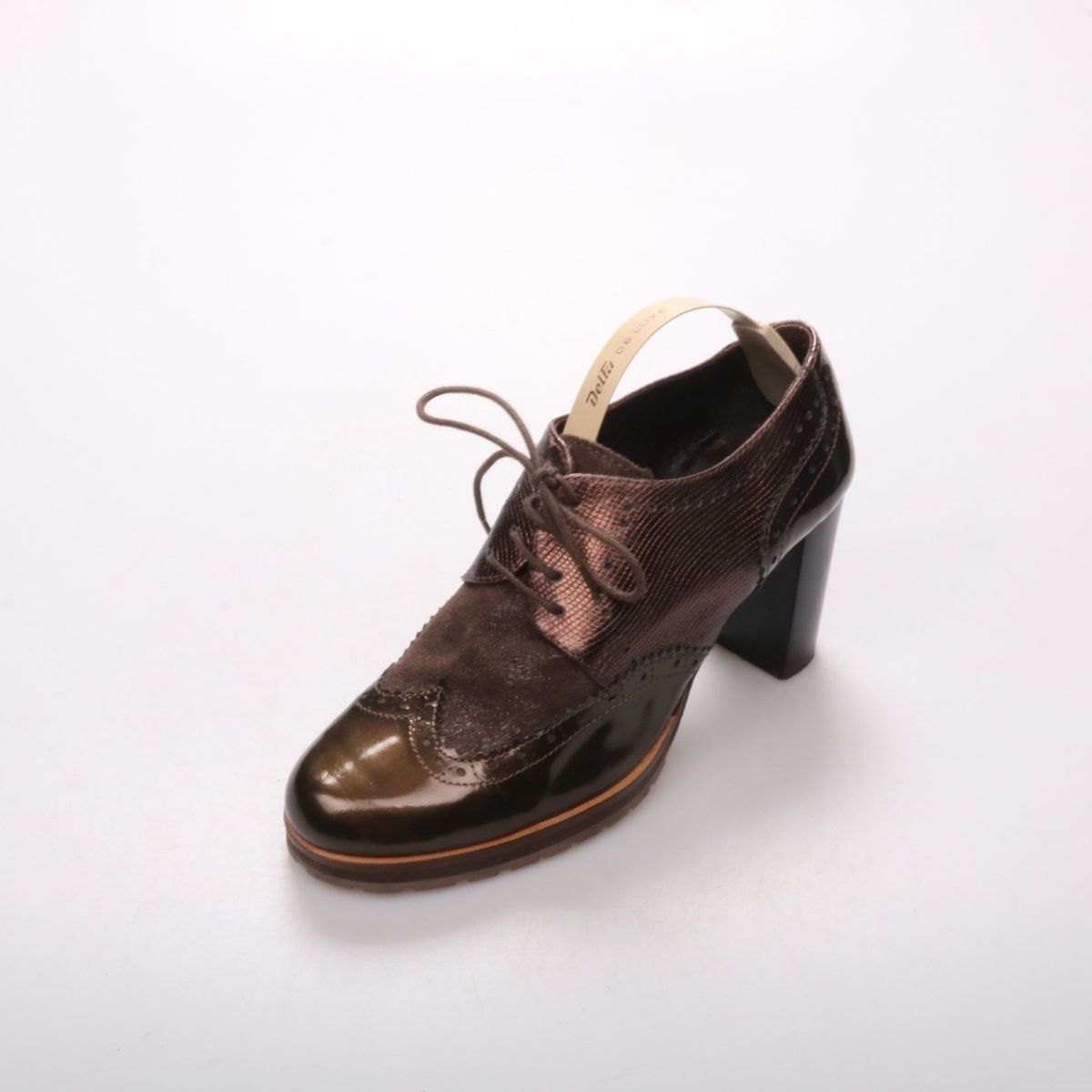 Женские ботильоны на устойчивом каблуке, в сочетании лакированной кожи и фактурного текстиля/замши, цвет тёмно-коричневый. Подойдут для повседневных и офисных образов в прохладную погоду. Шнуровка помогает отрегулировать посадку по подъёму, а рельефная подошва даёт лучшее сцепление.