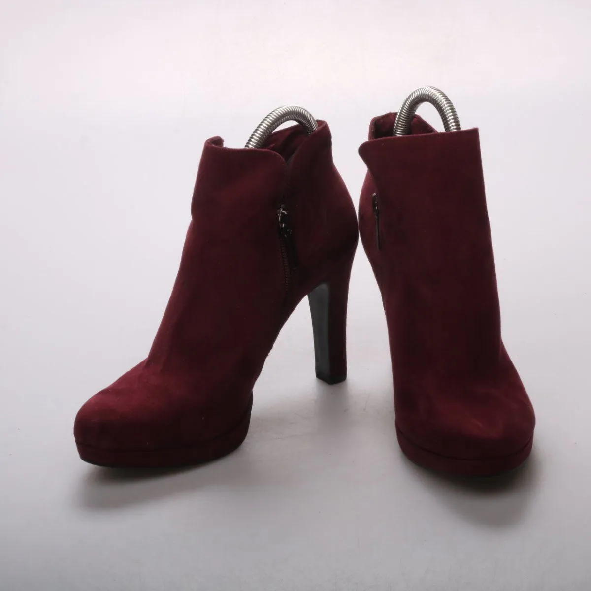 Бордовые ботильоны Tamaris из замши на высоком каблуке, с боковой молнией. Подойдут для осени и весны и хорошо смотрятся с платьями и брюками. Устойчивая подошва помогает уверенно ходить по городу.