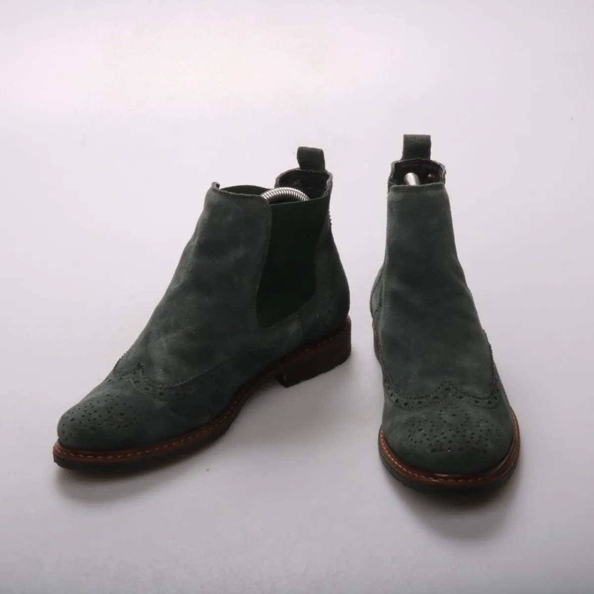 Ботильоны Anna Field premium в стиле челси из зелёной замши с декоративной перфорацией (броги) на носке. Подойдут для повседневных образов в межсезонье и хорошо сочетаются с джинсами и платьями. Эластичные вставки по бокам помогают быстро надевать обувь и обеспечивают комфортную посадку.