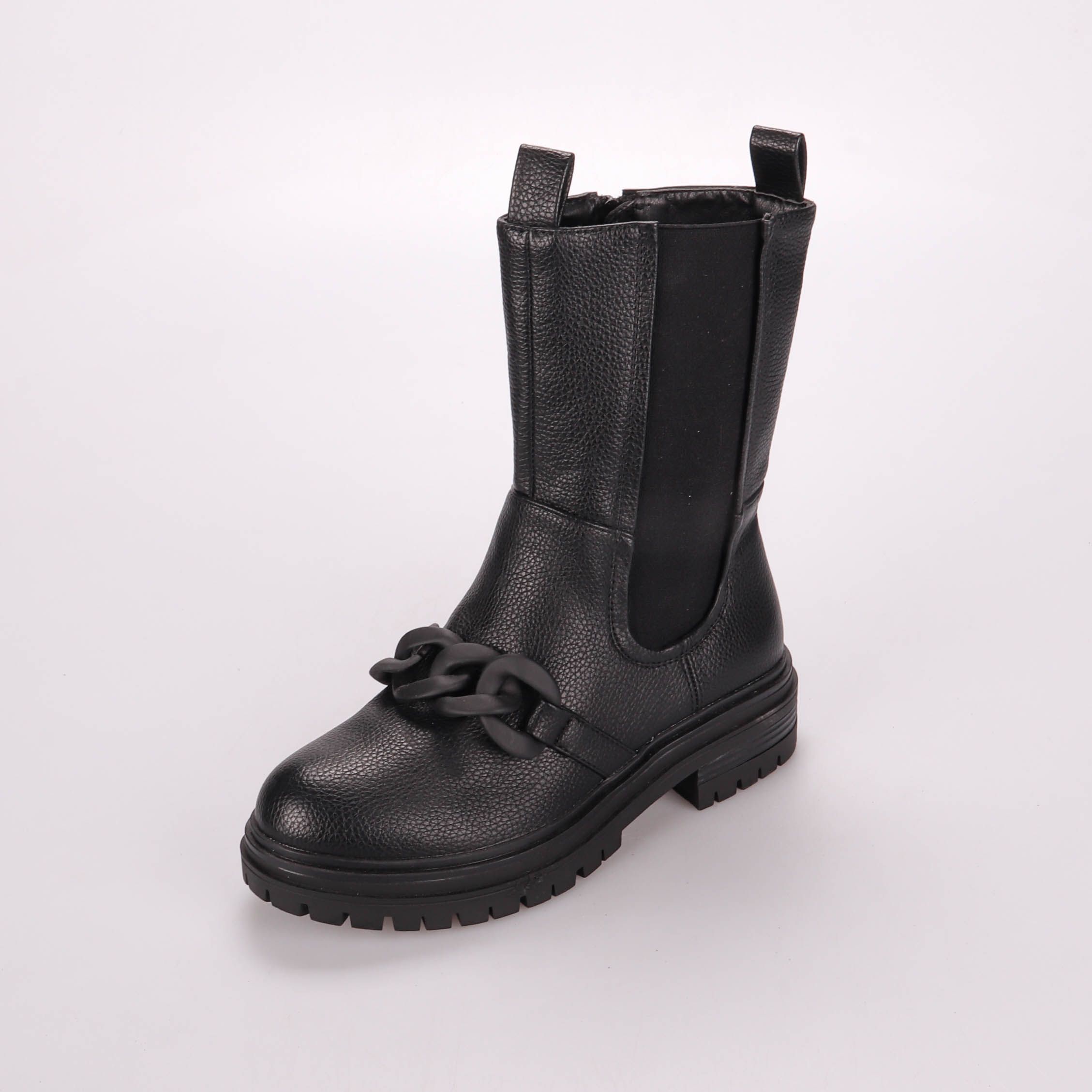 Женские черные ботинки с декоративной цепью на подъеме и удобной молнией сбоку. Подойдут на каждый день в демисезон — хорошо смотрятся с джинсами, брюками и платьями. Рельефная тракторная подошва дает устойчивость и меньше скользит на мокрой дороге.