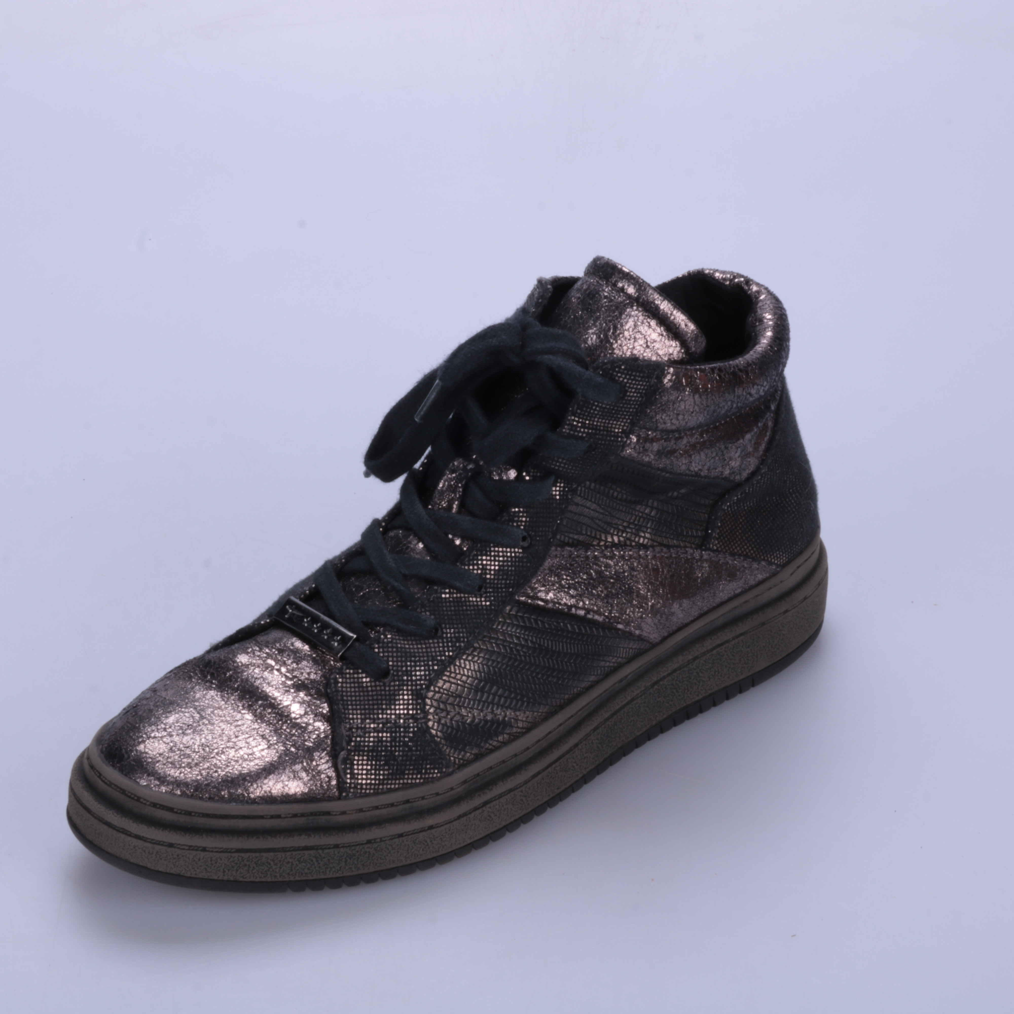 Женские демисезонные ботинки на шнуровке с боковой молнией, верх с металлизированным эффектом. Подойдут на каждый день в городе и для прогулок в прохладную погоду. Практичная толстая подошва обеспечивает устойчивость и удобство при ходьбе.