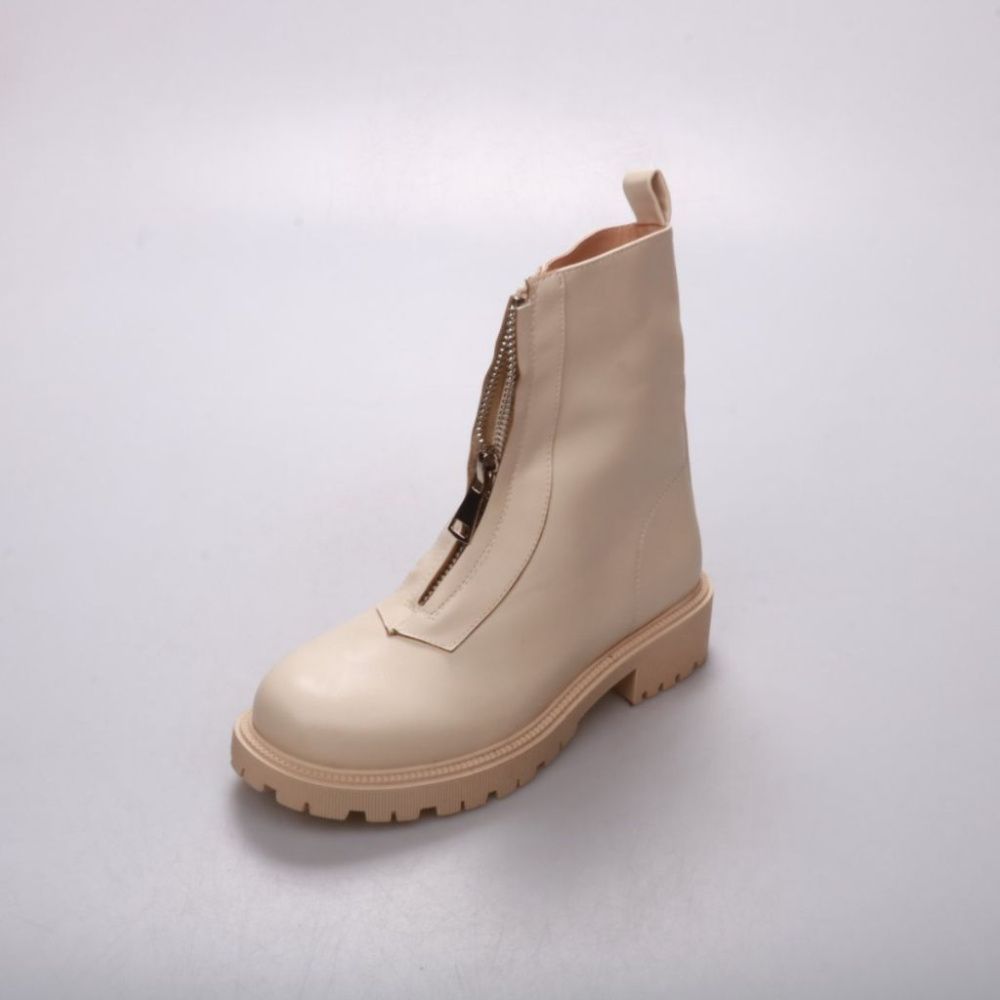 Женские бежевые ботинки на массивной тракторной подошве с застёжкой-молнией спереди. Подойдут для повседневных образов в прохладную погоду и межсезонье. Рельефный протектор даёт устойчивость и лучшее сцепление на мокрой поверхности.