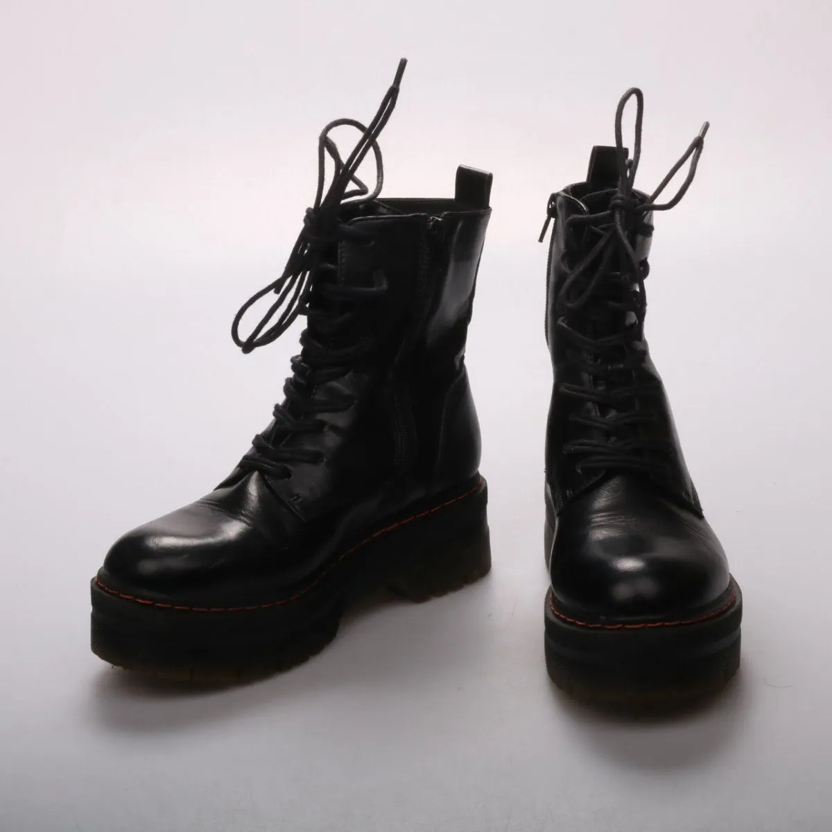 Кожаные ботинки на шнуровке с боковой молнией и массивной платформенной подошвой, цвет чёрный. Подойдут для повседневной носки в городе в прохладную погоду и хорошо сочетаются с джинсами и платьями. Толстая рифлёная подошва даёт устойчивость и лучше держит сцепление на мокрой поверхности.