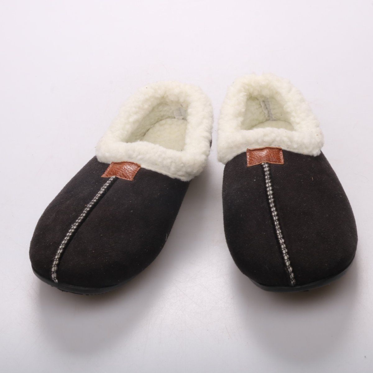Домашние тапочки без указания бренда, закрытый нос и мягкая белая меховая окантовка. Подойдут для дома в холодное время года, чтобы ногам было тепло. Рифлёная подошва помогает меньше скользить на гладком полу.
