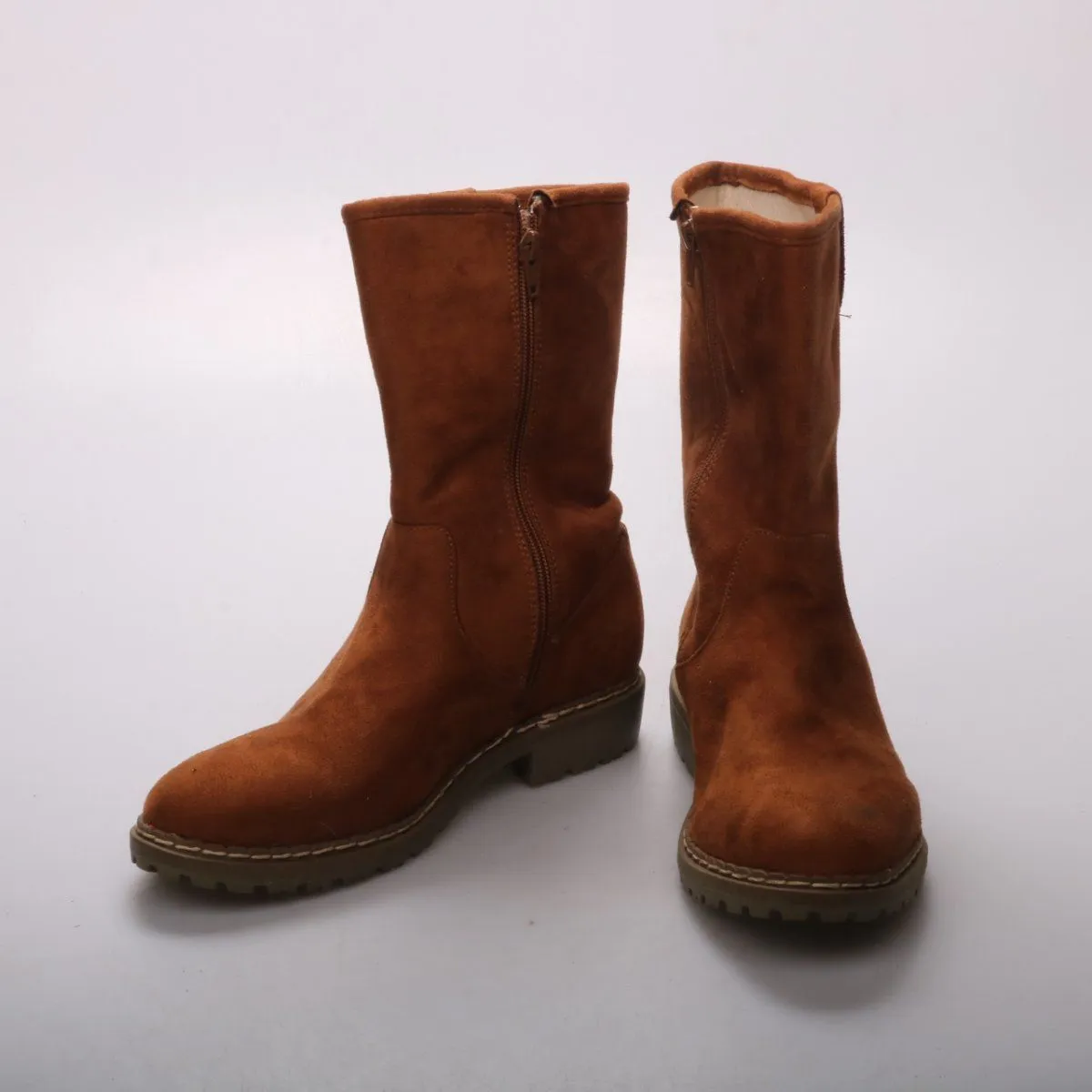 Полусапоги Esmara из коричневой замши с боковой молнией и невысоким устойчивым каблуком. Подойдут для повседневной носки в прохладную погоду, под джинсы и брюки. Рельефная подошва даёт хорошее сцепление на улице.