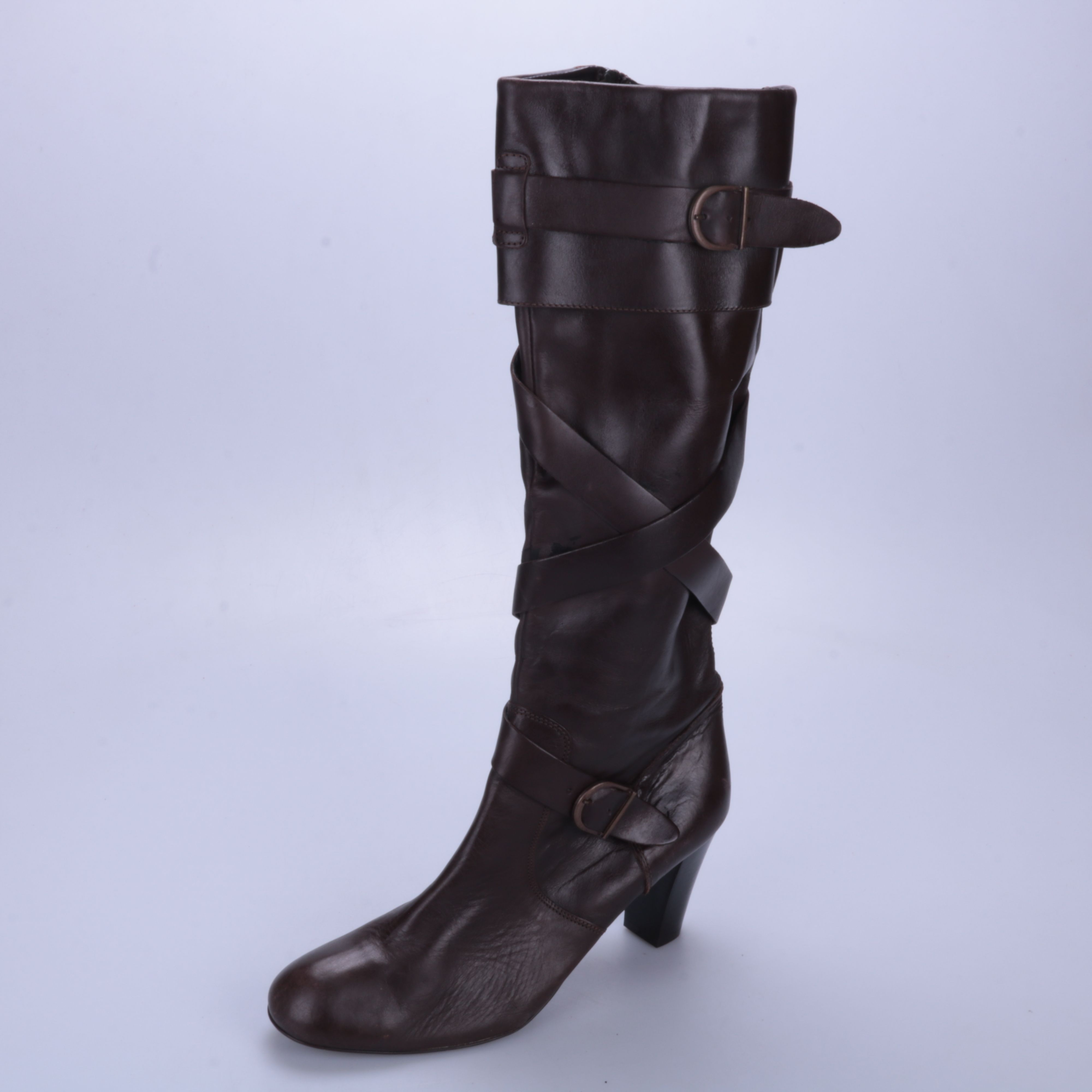 Женские сапоги из гладкой кожи тёмно-коричневого цвета, с ремешками и декоративными пряжками. Подойдут для повседневных образов в прохладную погоду, хорошо смотрятся с платьями, юбками и джинсами. Удобная молния сбоку облегчает надевание.