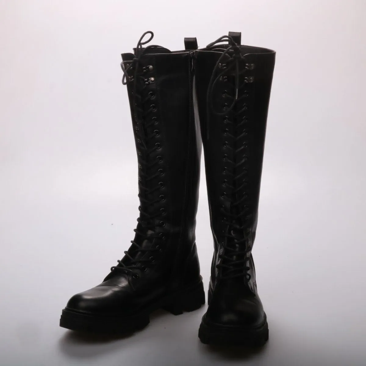 Высокие чёрные сапоги на шнуровке без бренда, с боковой молнией и массивной подошвой. Подойдут для повседневных образов и прогулок в прохладную погоду. Практичное преимущество — толстая рельефная подошва лучше держит сцепление с дорогой.