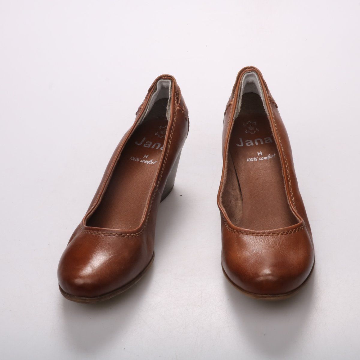 Женские туфли Jana из коричневой кожи на устойчивом каблуке. Подойдут для офиса и повседневных образов, легко сочетаются с платьями и брюками. Плотная посадка и удобная колодка помогают комфортно носить их в течение дня.