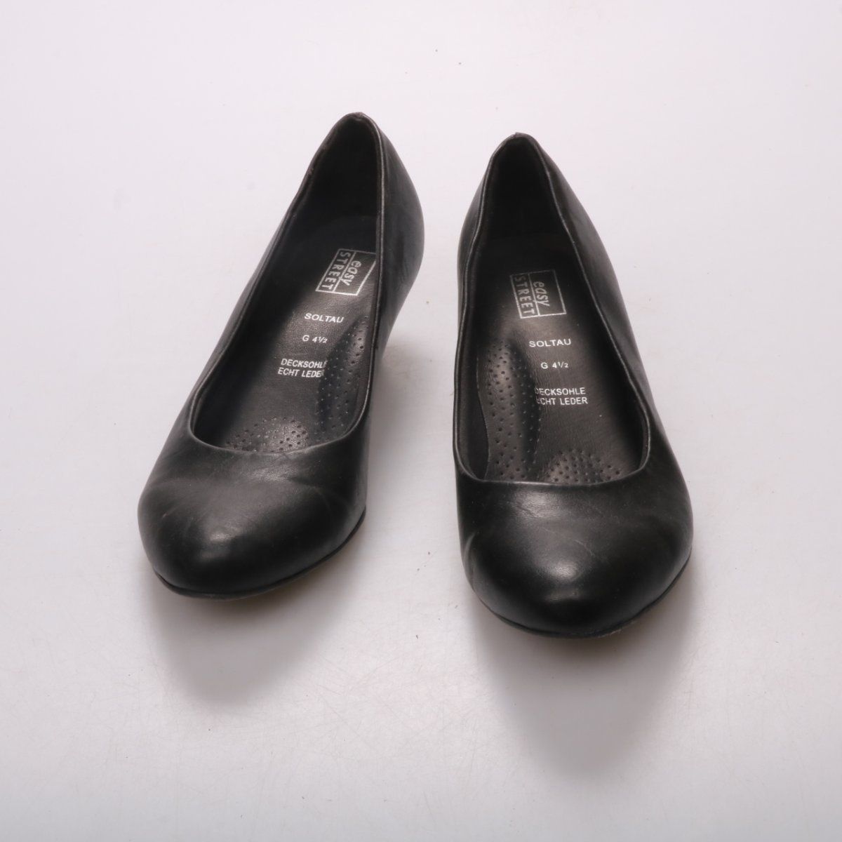 Классические женские туфли Easy Street из чёрной гладкой кожи на невысоком каблуке. Подойдут для офиса и повседневных образов, легко сочетаются с платьями и брюками. Практичное преимущество — кожаная стелька (Echt Leder) и устойчивый каблук для комфортной носки.
