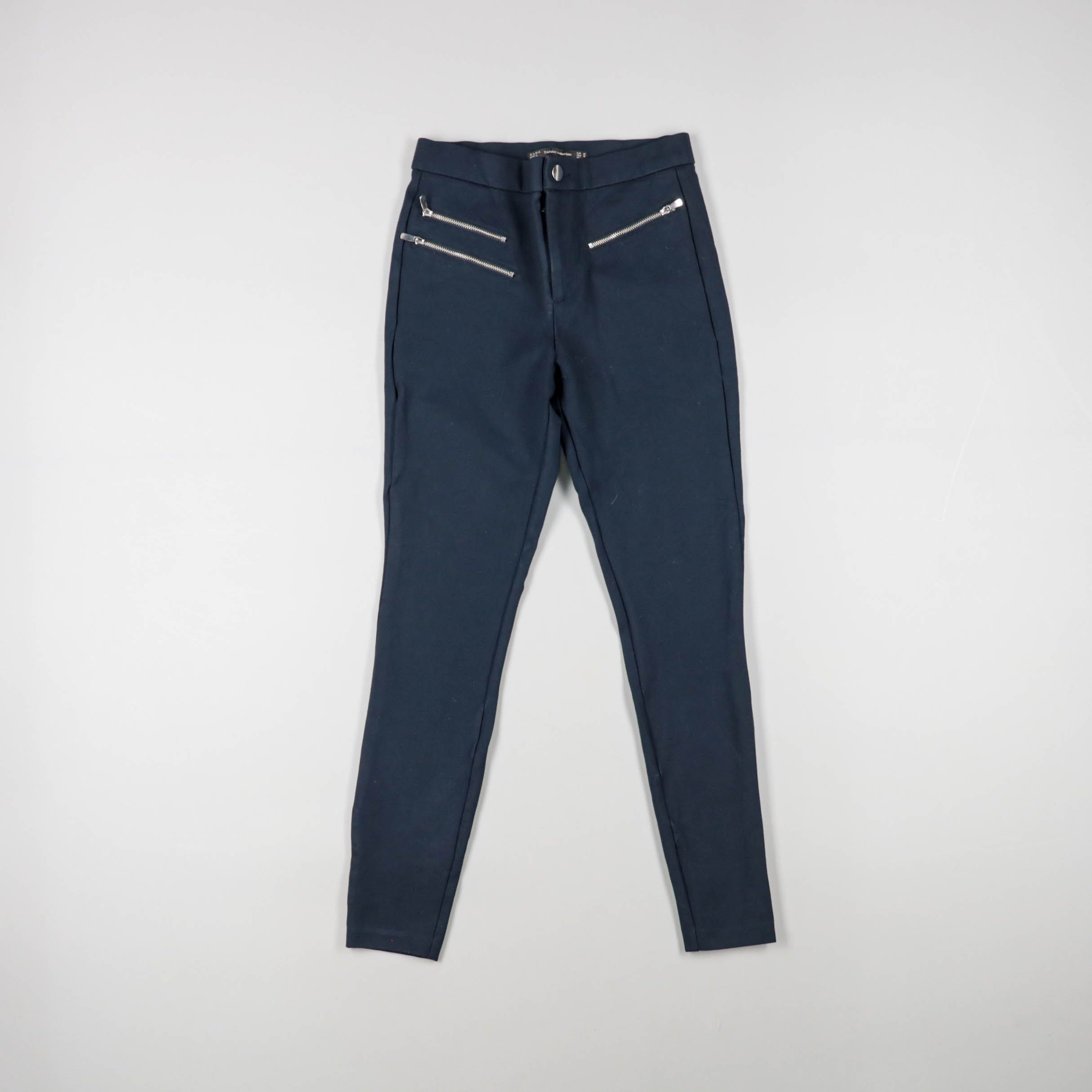 Женские зауженные брюки тёмно-синего цвета с декоративными молниями спереди. Подойдут для офисных и повседневных образов в демисезон, хорошо сочетаются с рубашкой или свитером. Практичны тем, что плотная ткань держит форму и не выглядит мятой.