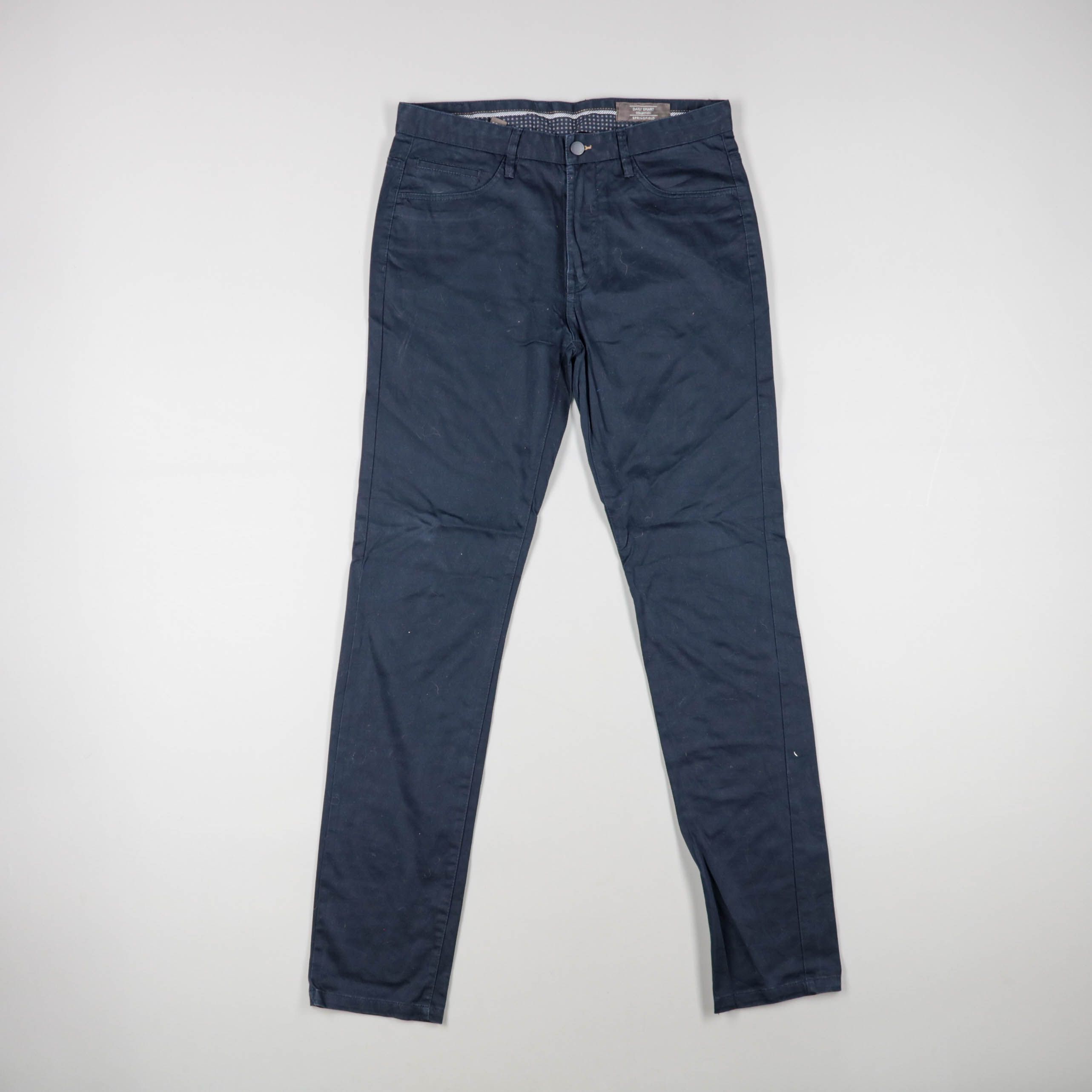 Мужские брюки тёмно-синего цвета, зауженный крой, застёжка на молнию и пуговицу, карманы спереди и сзади. Подойдут для повседневной носки и офиса в стиле casual. Плотная ткань с добавлением эластана даёт чуть больше комфорта в движении.
