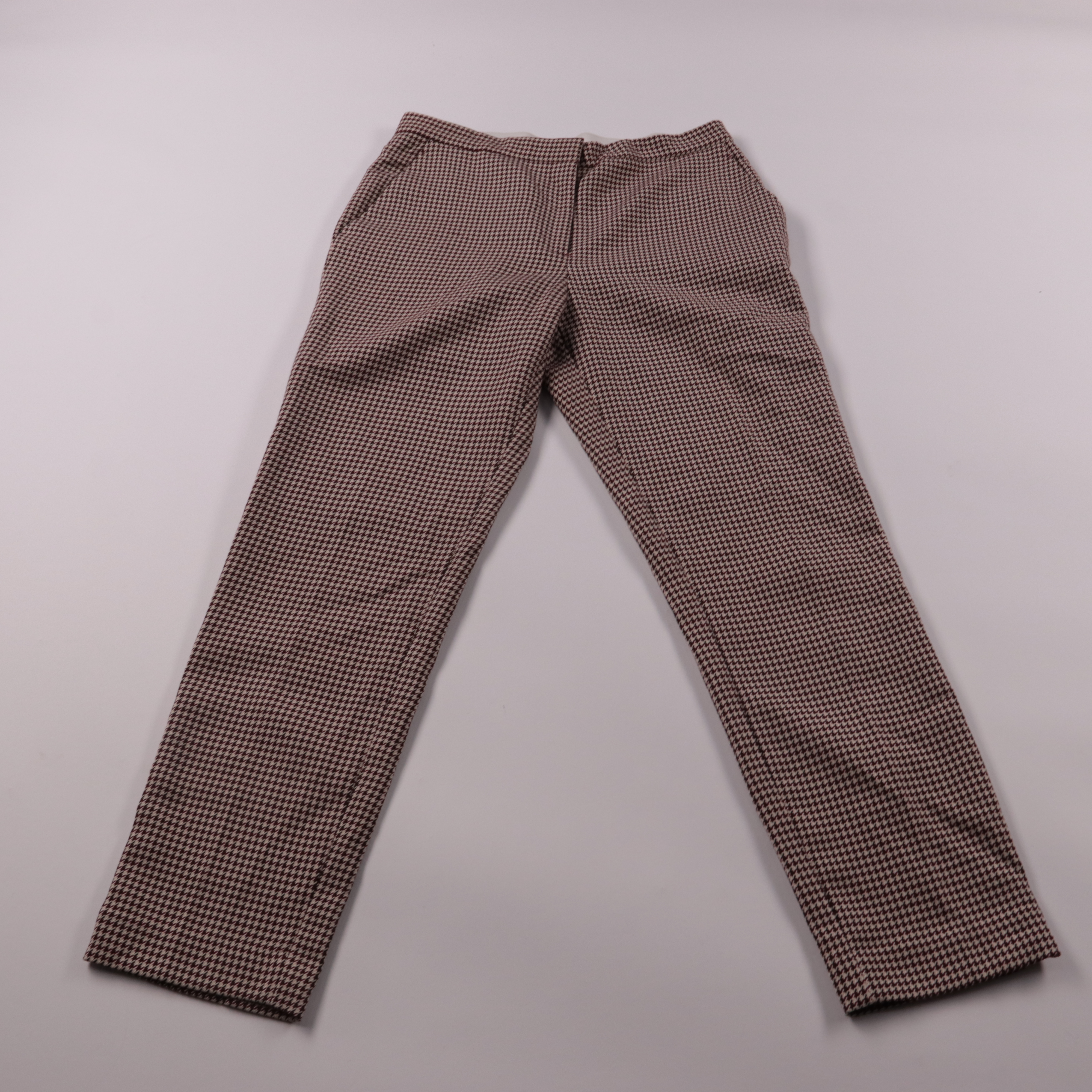 Женские брюки H&M с мелким принтом «гусиная лапка» в бордово-бежевой гамме. Подойдут для офиса и повседневных образов в демисезон, хорошо сочетаются с однотонными свитерами и жакетами. Ткань со стрейчем комфортно садится по фигуре и не стесняет движения.