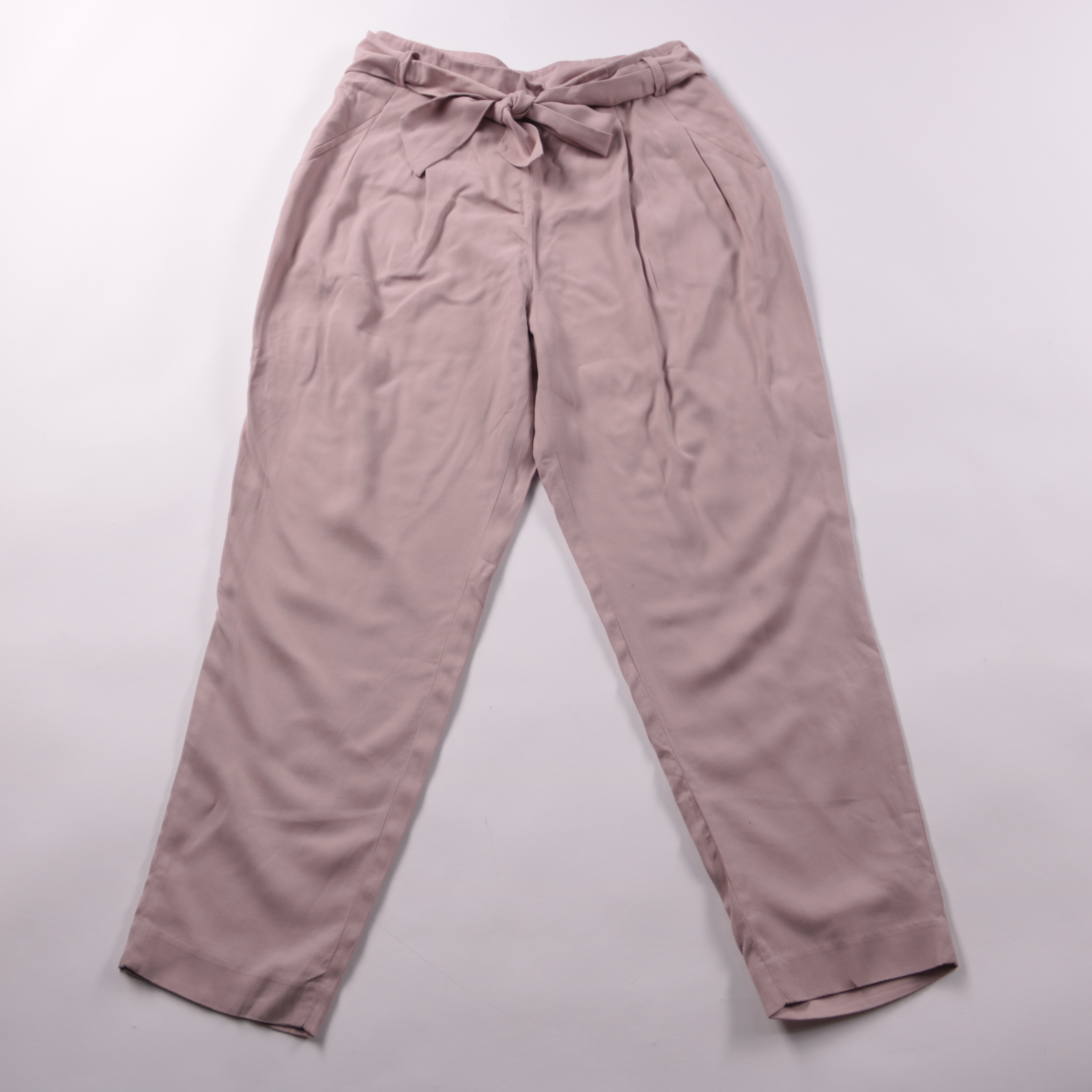 Женские брюки H&M Conscious пыльно-розового цвета с высокой посадкой и поясом-бантом. Подойдут для офиса и повседневных образов с рубашкой или топом, крой прямой и аккуратно держит силуэт. Практичный плюс — есть карманы и материал с содержанием лиоцелл...