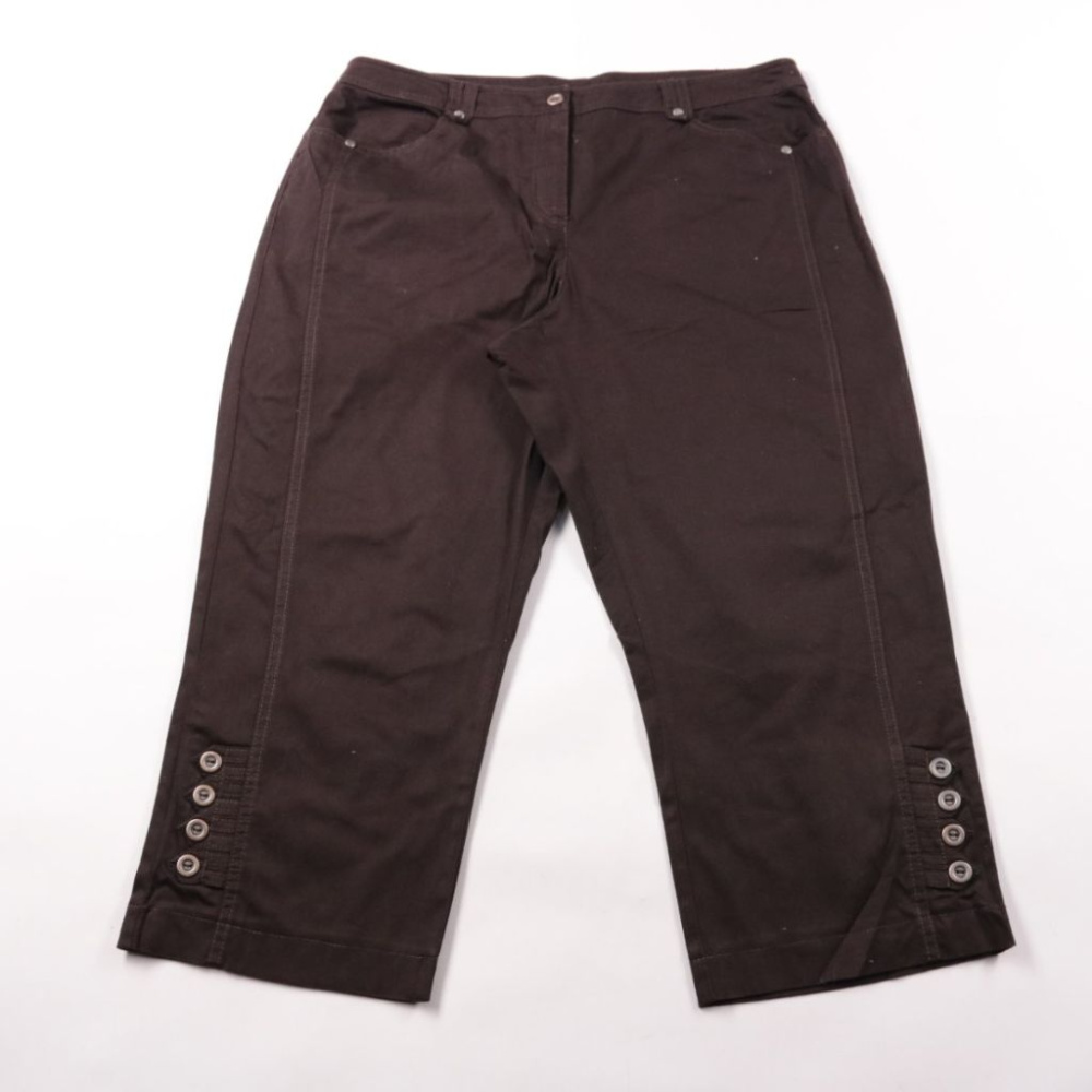 Женские укороченные брюки Canda (C&A) тёмно-коричневого цвета, застёжка на молнию и пуговицу, по низу штанин декоративные пуговицы. Подойдут для повседневных и офисных образов в прохладную погоду, хорошо сочетаются с рубашками и жакетами. Плотная ткань...