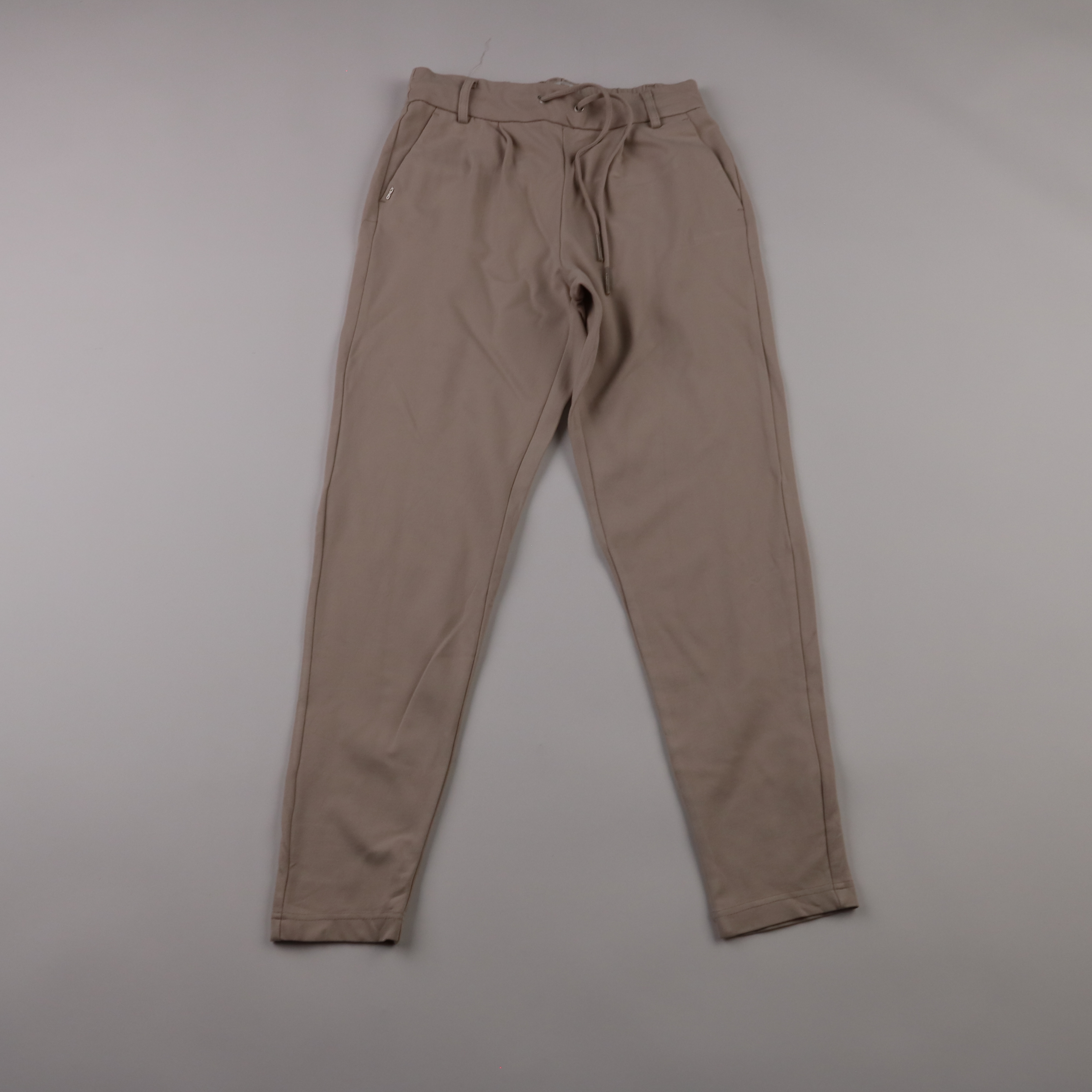 Женские брюки Only в бежевом цвете, зауженного кроя, с поясом на резинке и шнурком. Подойдут для повседневных образов и офиса в стиле casual, хорошо сочетаются с кедами и лоферами. Практичный плюс — комфортная посадка и удобные карманы.