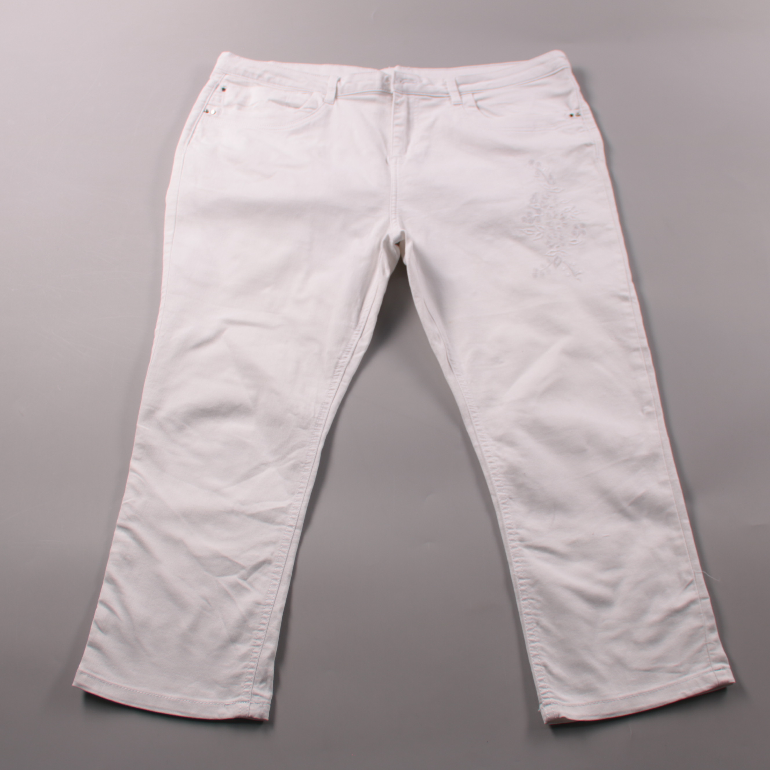 Женские белые брюки из хлопка с добавлением эластана, с классическими карманами и застёжкой на молнию. Подойдут для повседневных образов и на тёплую погоду благодаря светлому цвету. Практичный плюс — ткань немного тянется и комфортно садится по фигуре.