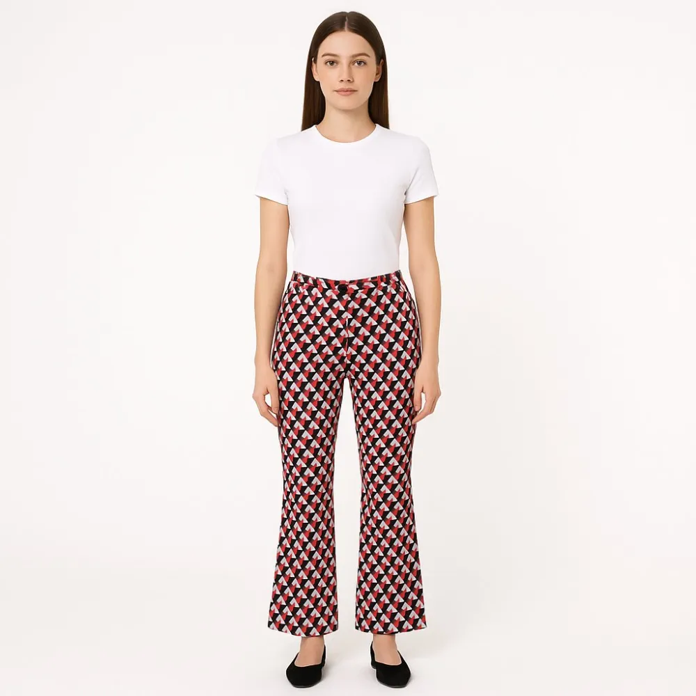 Женские брюки Maria Jacobi с геометрическим принтом в красно-бело-чёрной гамме, прямого кроя. Подойдут для повседневных и офисных образов в тёплое время года, хорошо сочетаются с однотонными футболками и рубашками. Практичный плюс — немаркая расцветка ...