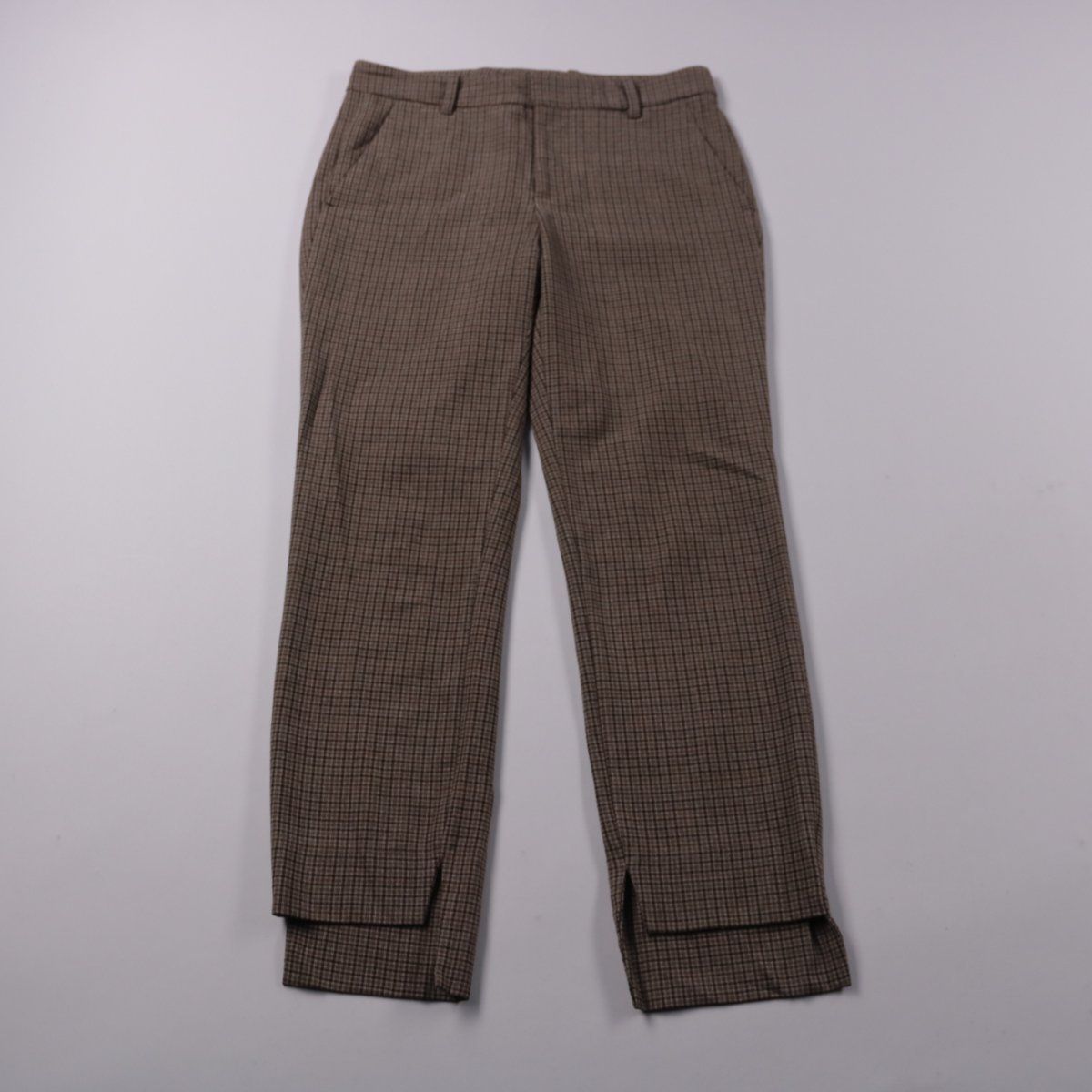 Классические женские брюки Zara в мелкую клетку, прямого кроя, с шлёвками под ремень и боковыми карманами. Подойдут для офиса и повседневных образов в демисезон. Практичный принт не слишком маркий и хорошо сочетается с базовыми вещами.