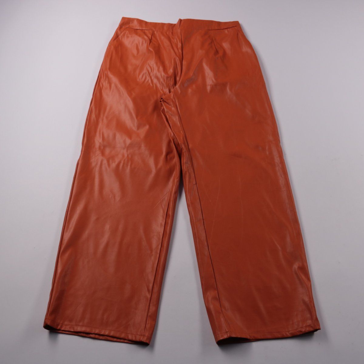 Женские брюки из искусственной кожи (полиуретан) прямого кроя, цвет рыже‑коричневый. Подойдут для повседневных образов в межсезонье и прохладную погоду. Материал легко протирается и не требует сложного ухода.