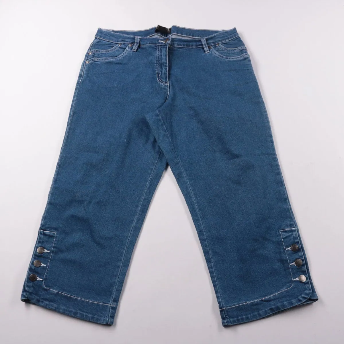 Джинсовые брюки Bpc из синего денима, укороченная длина с декоративными пуговицами по низу штанин. Подойдут для повседневной носки в городе и для прогулок, легко сочетаются с футболками и рубашками. Ткань с добавлением эластана немного тянется и комфортна в посадке.
