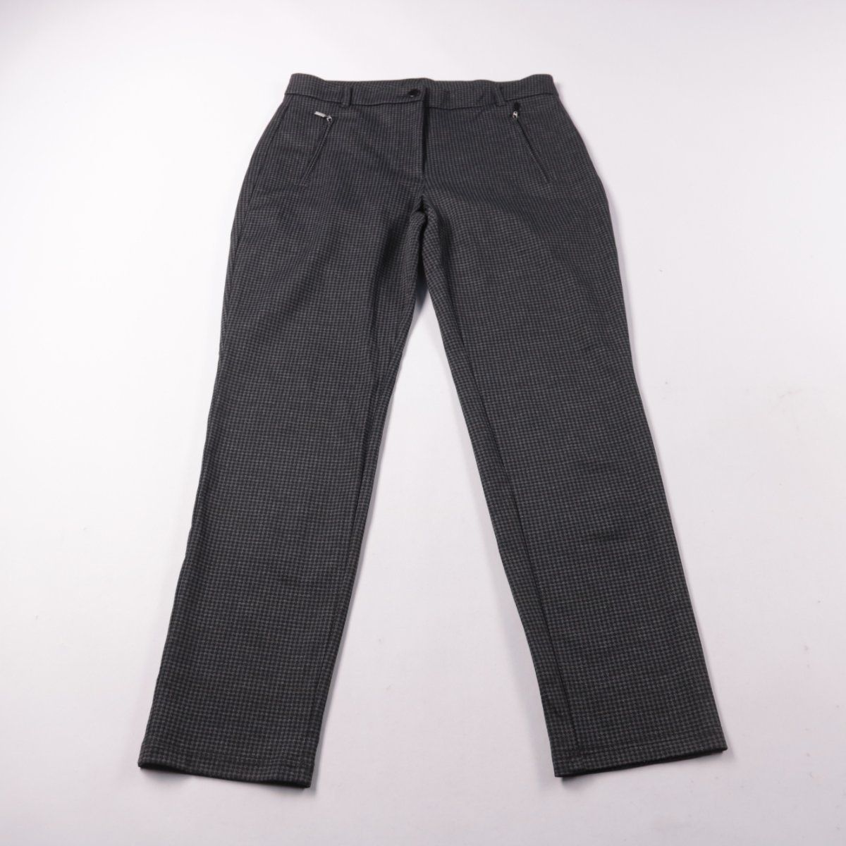 Женские брюки без указанного бренда, тёмно-серые в мелкую клетку, с застёжкой на молнию и карманами. Подойдут для офиса и повседневных образов в прохладную и тёплую погоду. Ткань с добавлением эластана чуть тянется и комфортнее садится по фигуре.
