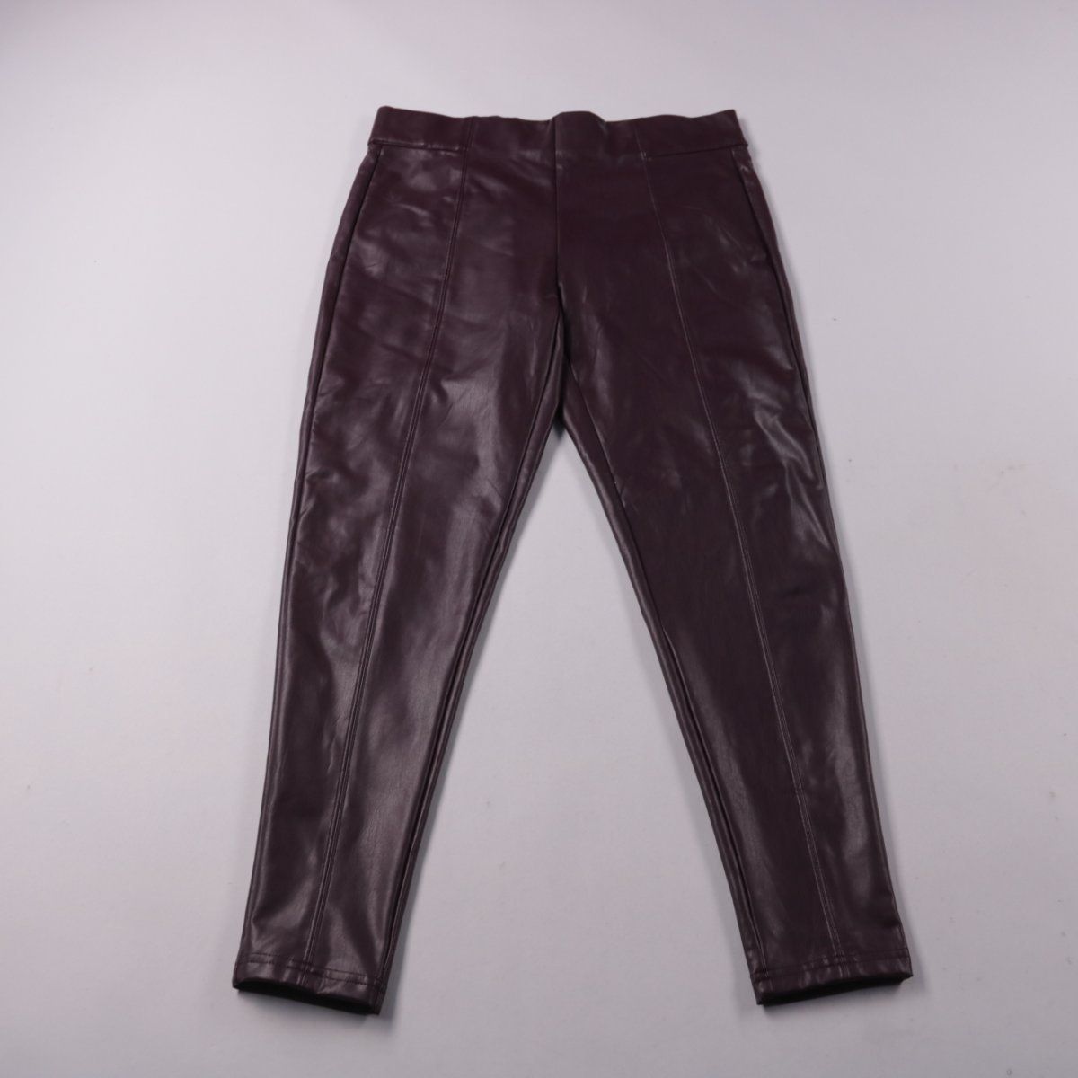 Брюки M&S Collection бордового цвета с покрытием под кожу и зауженным кроем. Подойдут для повседневных образов в прохладную погоду и в офис с нейтральным верхом. Ткань тянется и покрытие проще протирать от загрязнений.