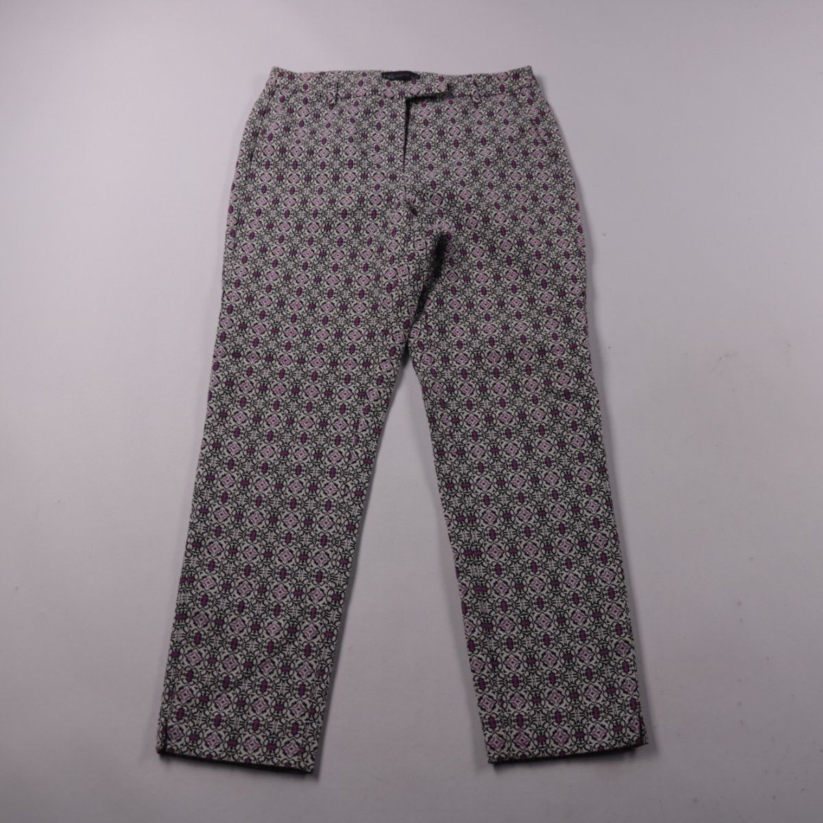 Брюки M&S с геометрическим принтом в черно-бело-фиолетовой гамме. Подойдут для повседневной носки и офиса с однотонным верхом. Практичный плюс — эластичная ткань, хорошо садится по фигуре.