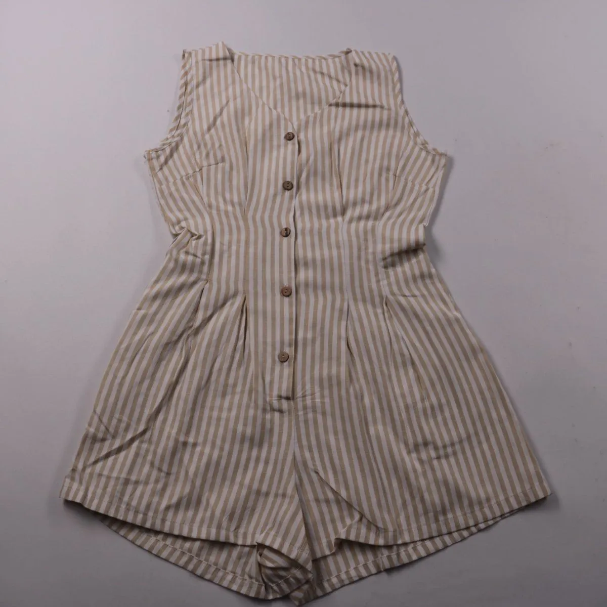Женский комбинезон-шорты в бежево-белую полоску, без рукавов, с застёжкой на пуговицы спереди. Подойдёт для летних прогулок и отдыха, легко сочетается с кедами или сандалиями. Ткань с добавлением эластана слегка тянется и комфортно садится по фигуре.