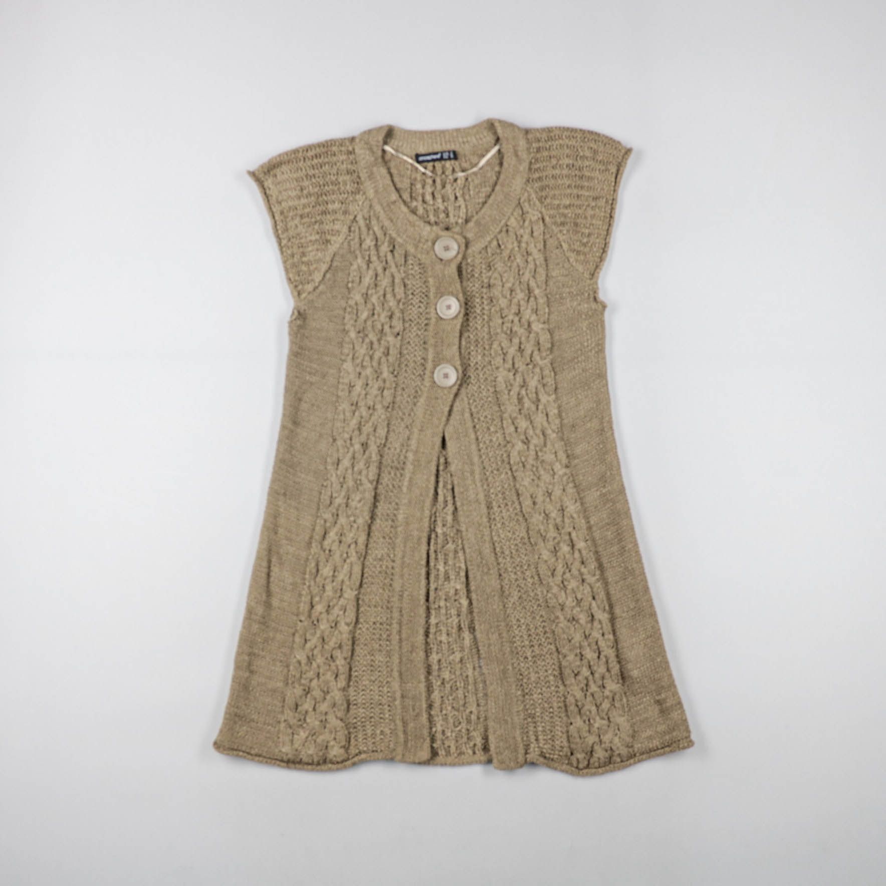 Вязаный кардиган без рукавов с фактурными косами и застёжкой на крупные пуговицы, бренд не указан. Подойдёт для многослойных образов поверх водолазки или лонгслива в прохладную погоду. Практичен тем, что легко комбинируется с джинсами и платьями и доба...