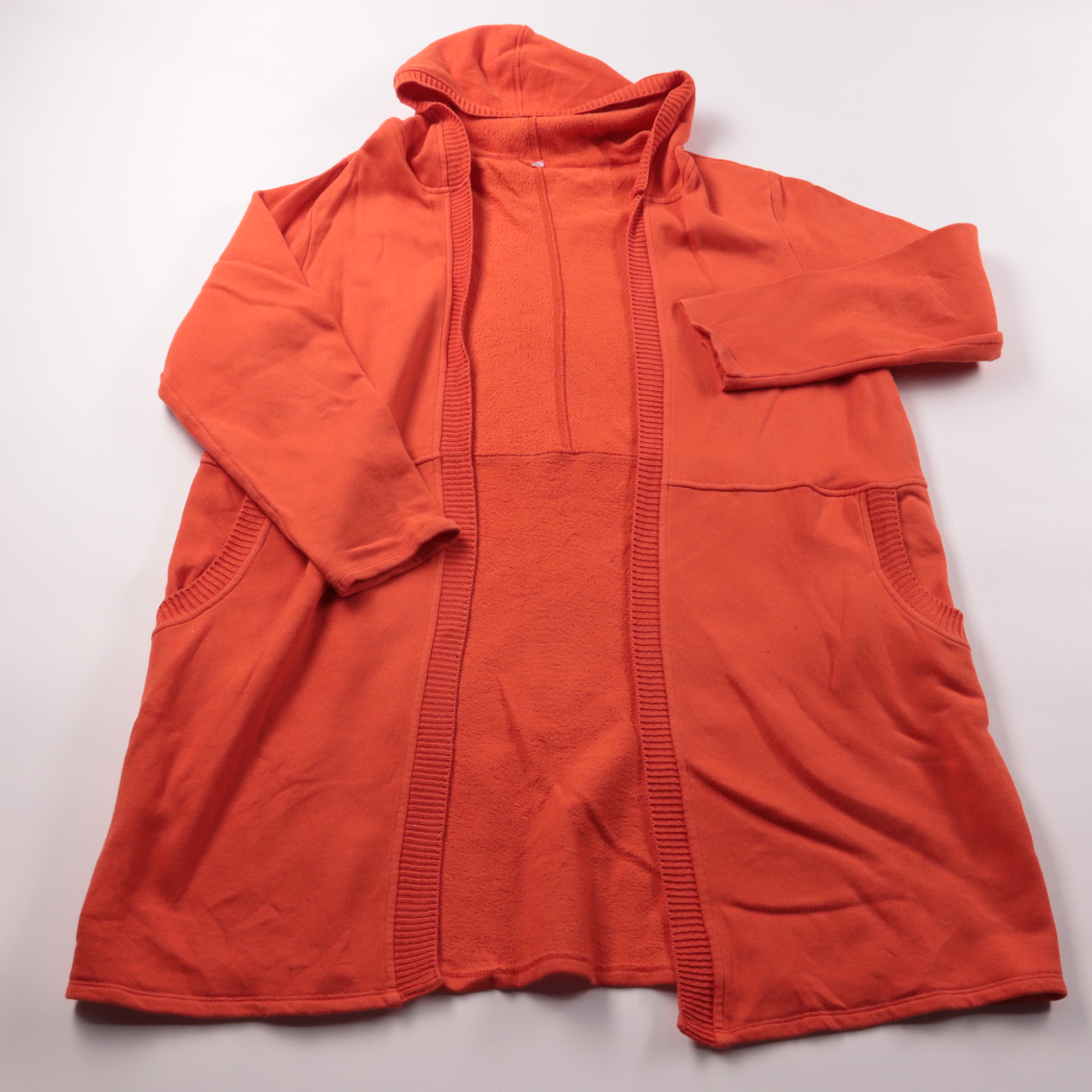 Удлинённый кардиган с капюшоном без застёжки, мягкий и тёплый за счёт флисовой изнанки. Подойдёт для прогулок и повседневных образов в прохладную погоду, удобно носить как верхний слой. Практичные боковые карманы и свободный крой не сковывают движения.