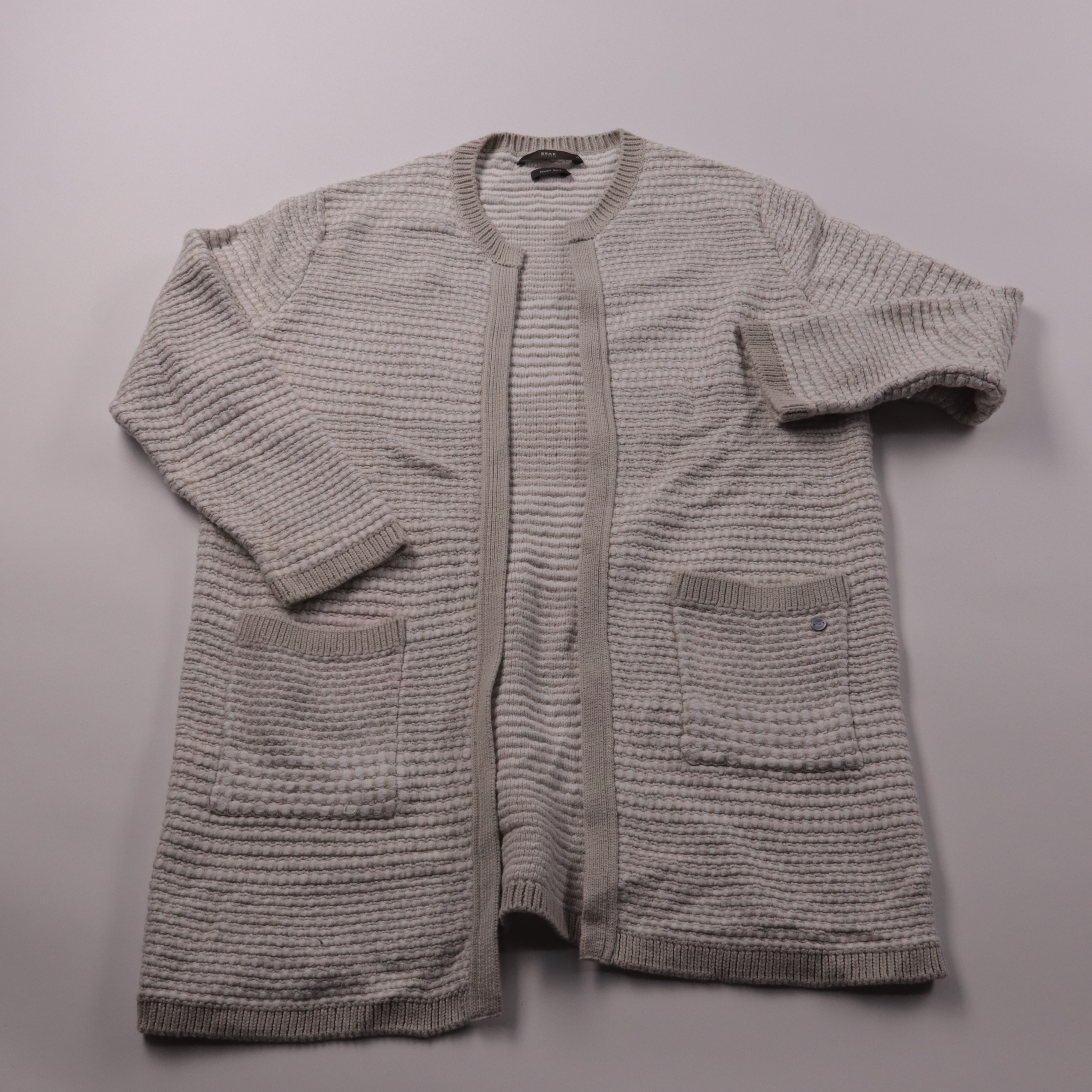 Кардиган Brax фактурной вязки в сером цвете, без застёжки, с двумя накладными карманами. Подойдёт для офиса и повседневных образов в прохладную погоду, легко сочетается с джинсами и платьями. Плотная вязка хорошо держит форму и приятно носится как верх...