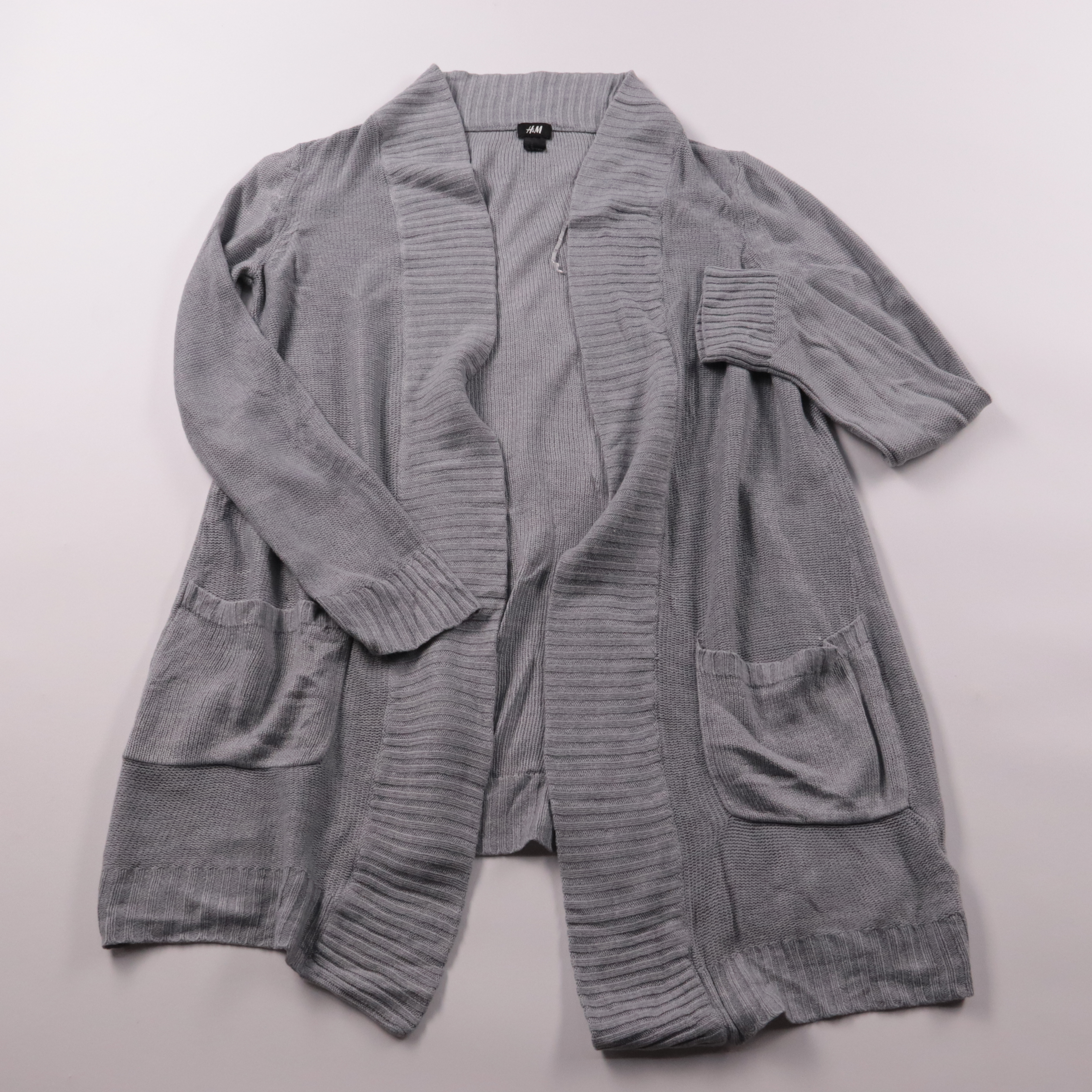 Серый вязаный кардиган H&M свободного кроя с открытым передом и накладными карманами. Подойдёт для офиса и повседневных образов в прохладную погоду, удобно накидывать поверх топа или платья. Акриловый трикотаж лёгкий в уходе и быстро сохнет.