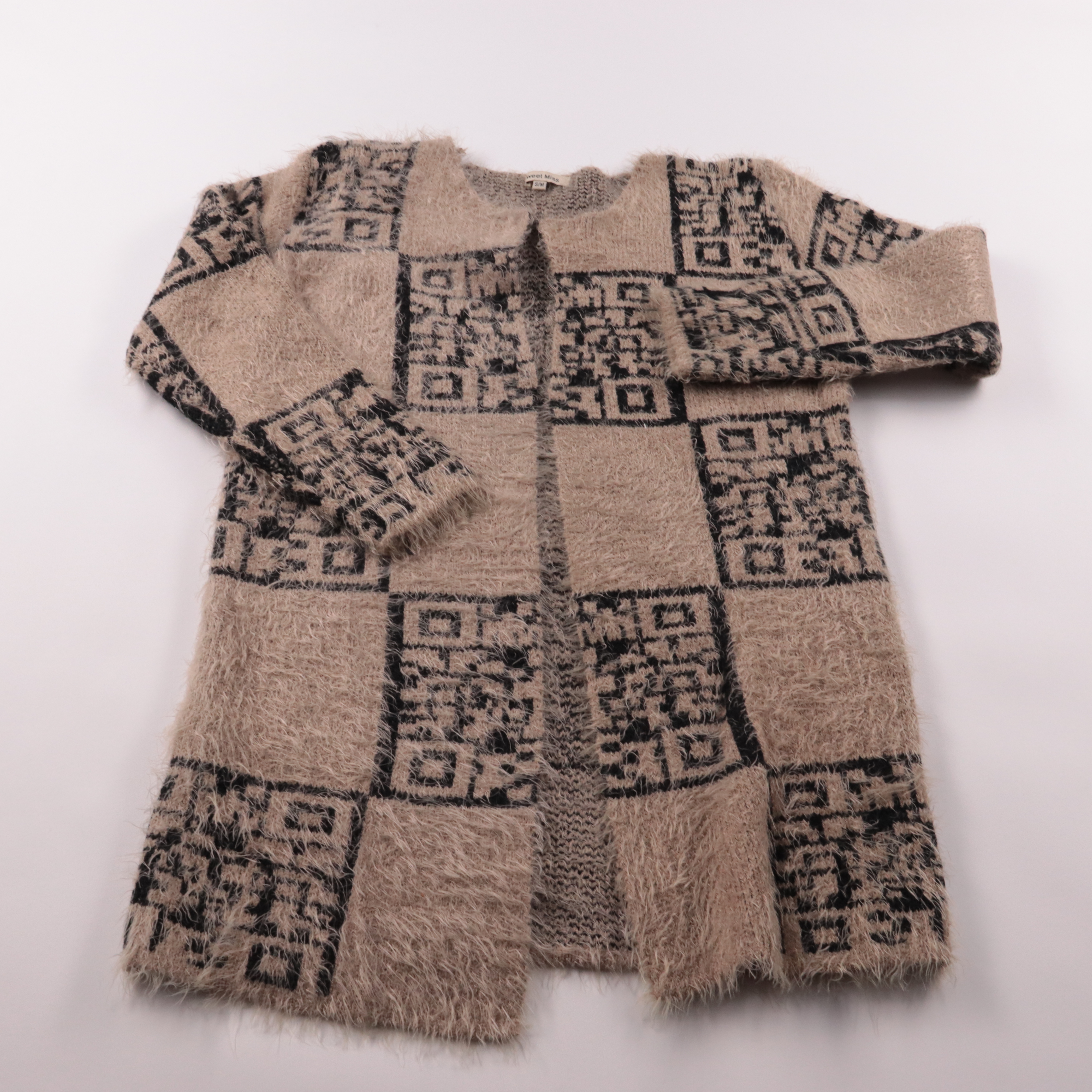 Кардиган Sweet Miss из пушистой пряжи в бежево-чёрной гамме с геометрическим узором. Подойдёт для прохладной погоды и многослойных образов с джинсами или платьем. Материал мягкий и тёплый, хорошо держит форму и прост в уходе.