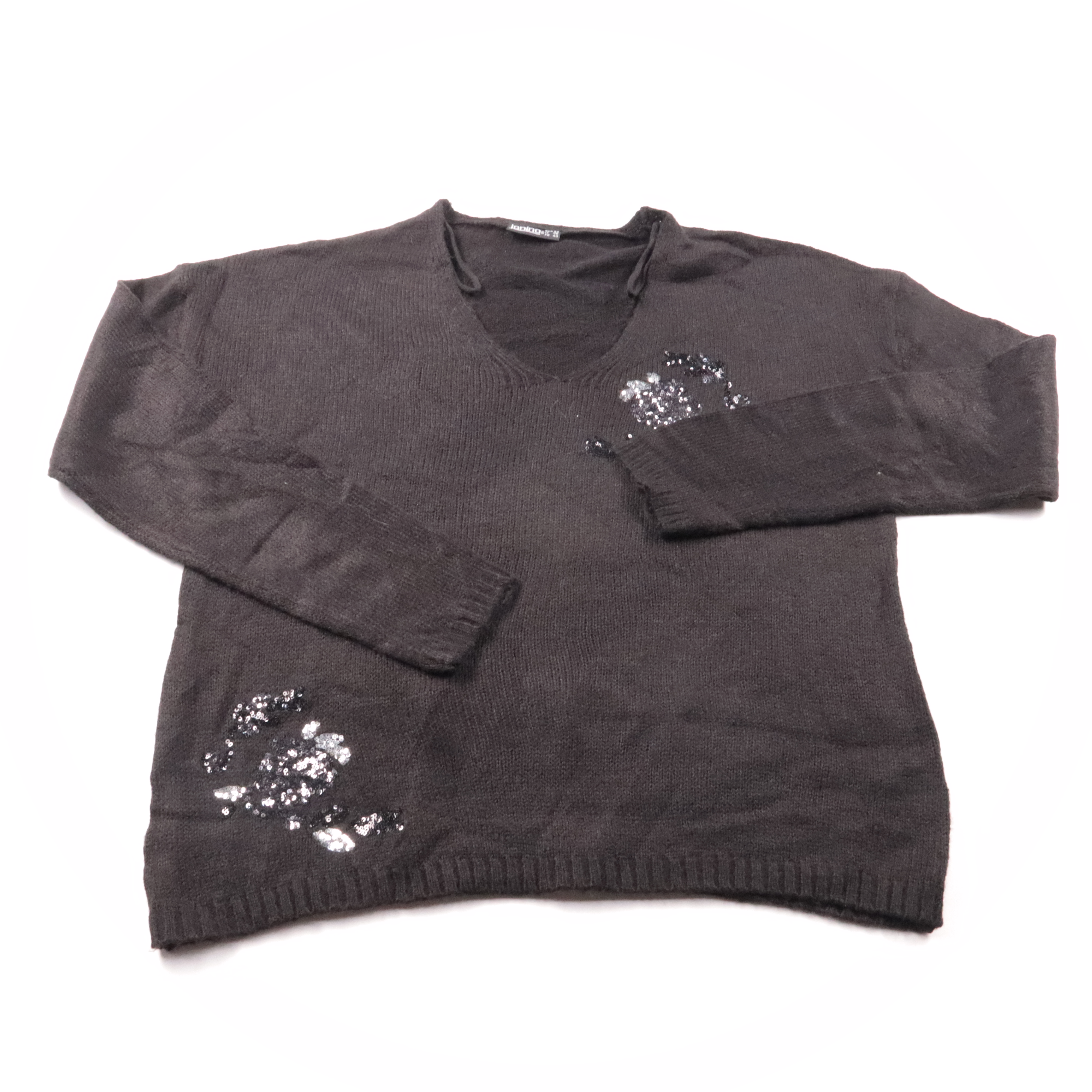 Женский джемпер Janina из акрила, чёрного цвета, с V-образным вырезом и декором пайетками. Подойдёт для повседневных образов и на выход, легко сочетается с джинсами и юбками. Материал неприхотлив в уходе и быстро сохнет.