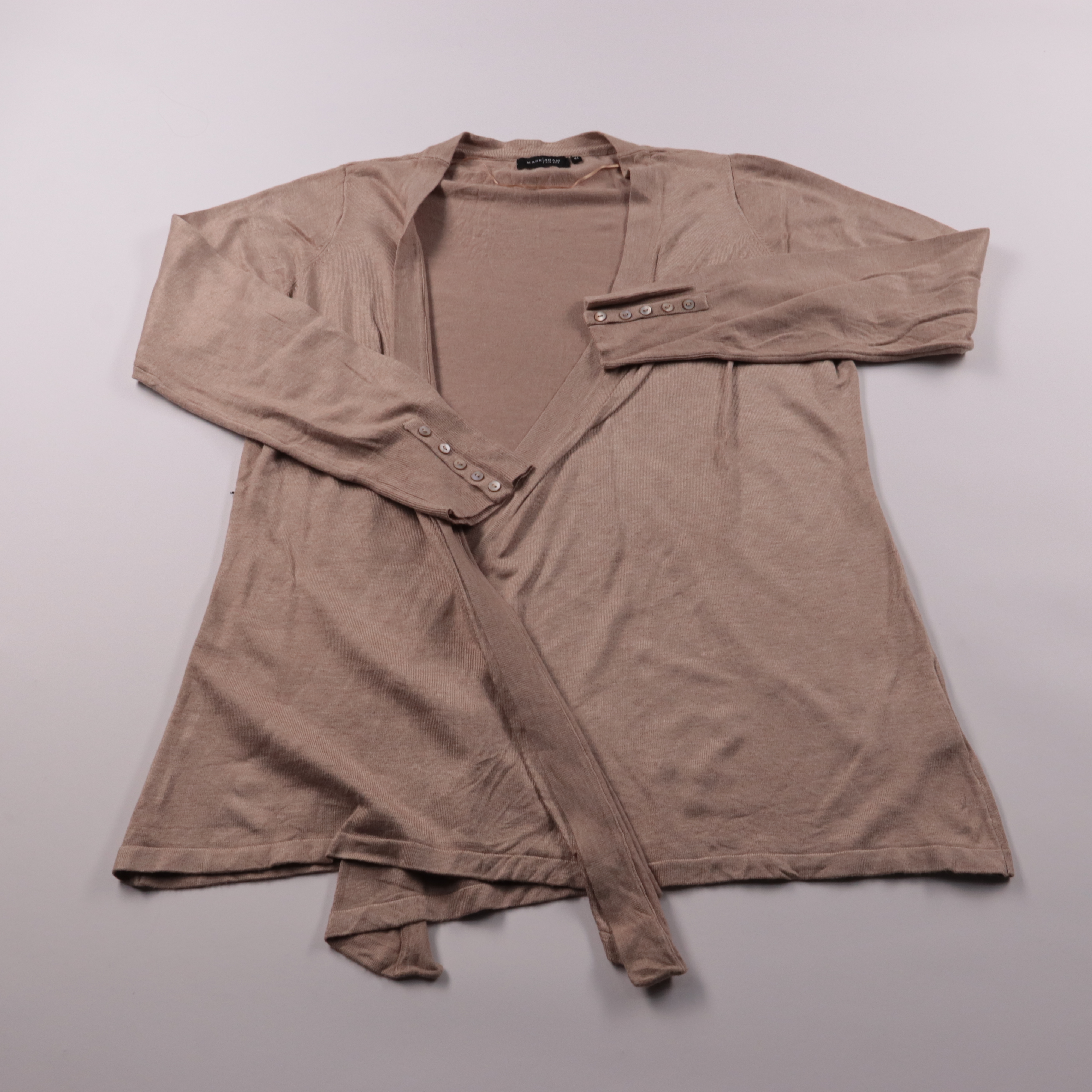 Кардиган Mark Adam в бежевом цвете, с запахом и поясом, длинный рукав с декоративными пуговицами на манжетах. Подойдёт для офиса и повседневных образов в прохладную погоду, удобно сочетать с топом, рубашкой или платьем. Тонкий трикотаж из вискозы прият...