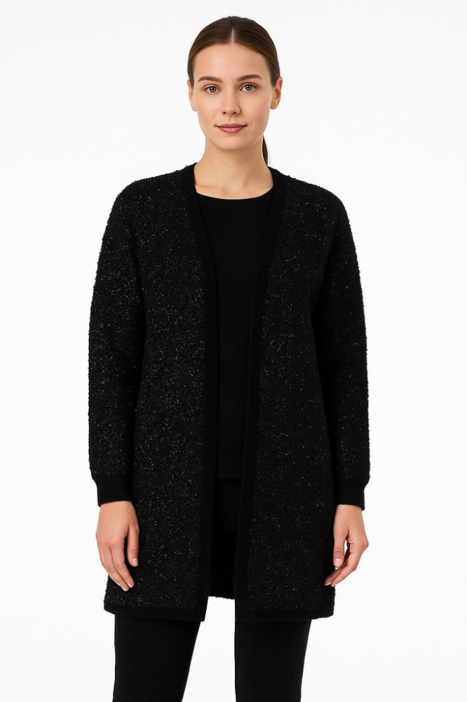 Кардиган Lyn Payers в чёрном цвете с лёгким блеском, прямого удлинённого кроя и без застёжки. Подойдёт для офиса и повседневных образов, хорошо смотрится поверх топа или платья. Мягкое полотно комфортно в носке и не сковывает движения.