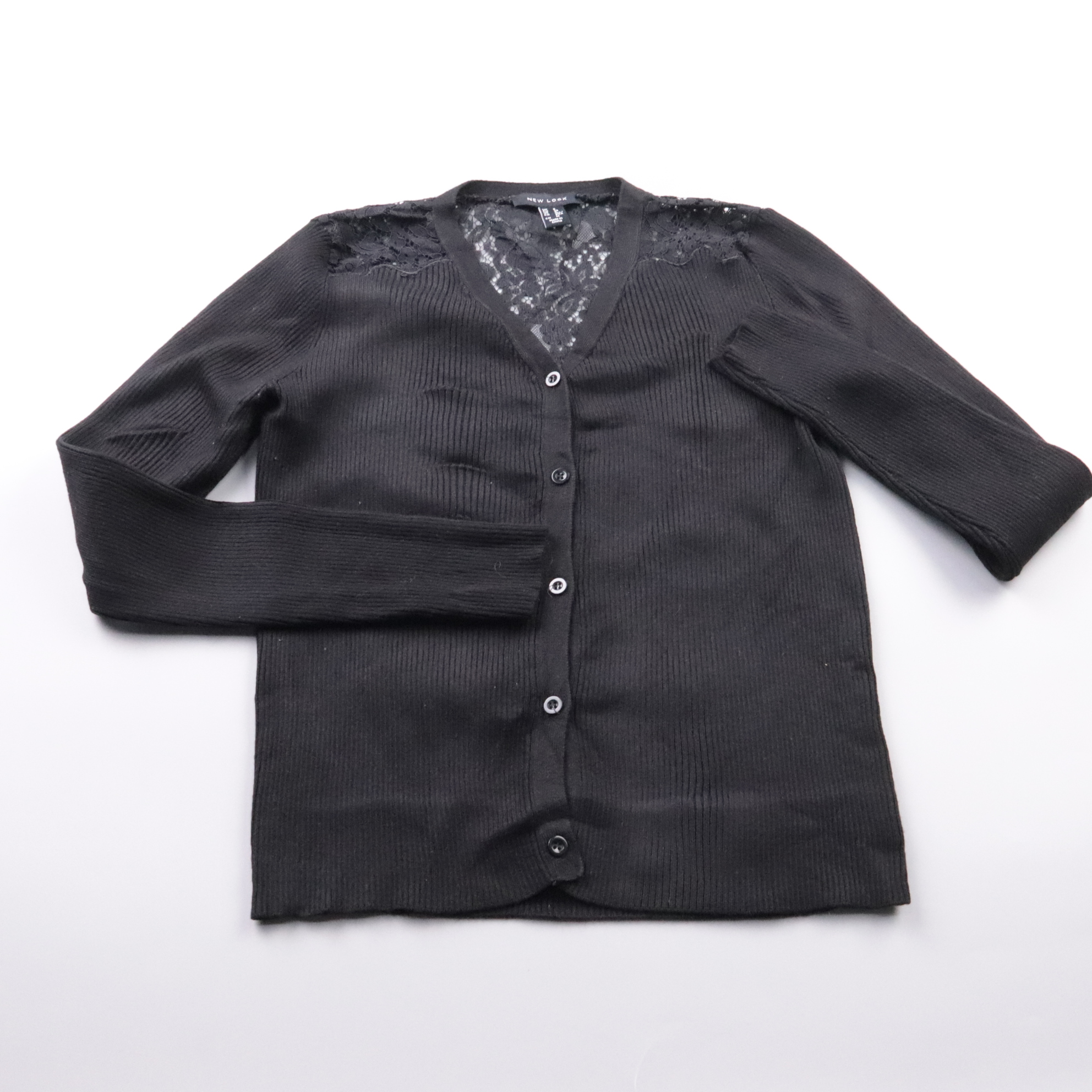 Кардиган New Look в чёрном цвете, с V‑вырезом и застёжкой на пуговицы, дополнен кружевными вставками у плеч и на спинке. Подойдёт для офиса и повседневных образов, удобно носить поверх топа или платья. Мягкий трикотаж хорошо тянется и не сковывает движ...