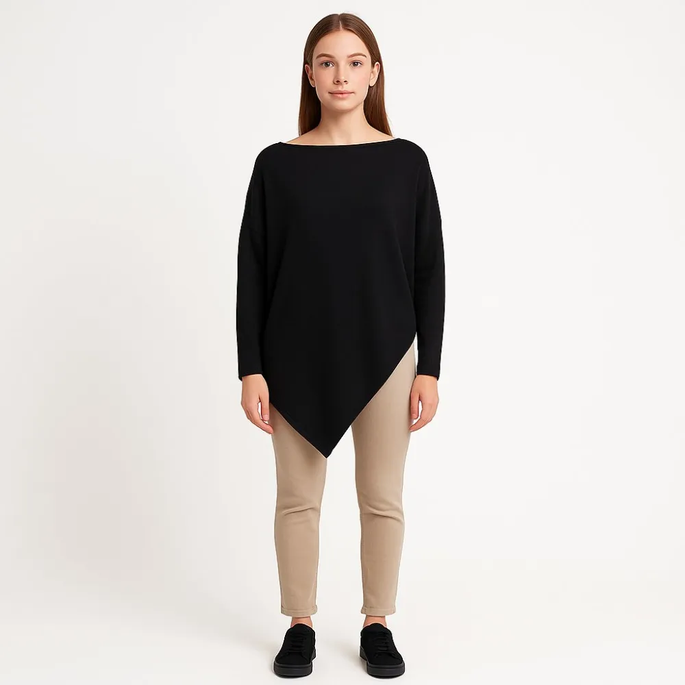 Чёрный джемпер Zara Knit свободного кроя с асимметричным заострённым низом. Подойдёт для повседневных образов и офиса, хорошо сочетается с брюками и джинсами. Практичен тем, что базовый цвет легко комбинируется и не требует сложного ухода.